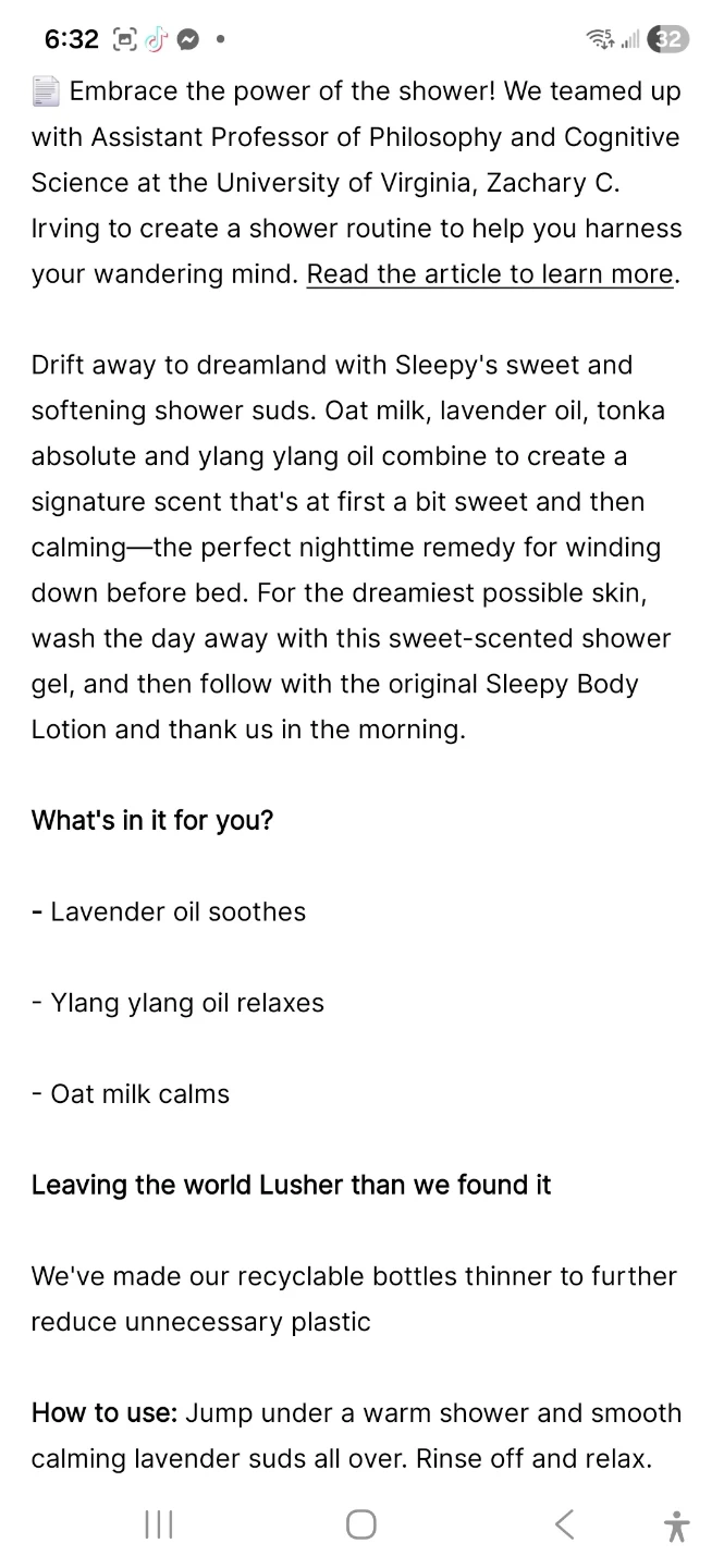 Deeply relaxing lavender shower gel by Lush. It's a sweet and calming scent, perfect for winding down before bed. Contains lavender oil to soothe, ylang ylang oil to relax, and oat milk to calm. Bottle made from recycled materials.