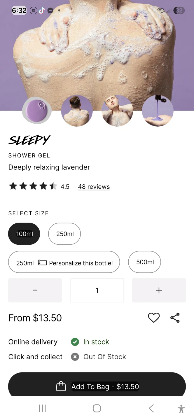 Deeply relaxing lavender shower gel by Lush. It's a sweet and calming scent, perfect for winding down before bed. Contains lavender oil to soothe, ylang ylang oil to relax, and oat milk to calm. Bottle made from recycled materials.