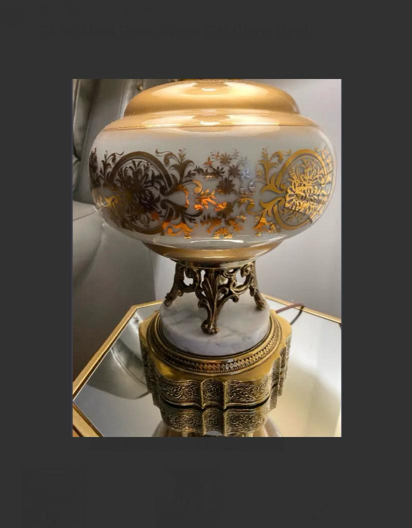 Selling a beautiful vintage antique table lamp. It features a unique design with gold accents and a decorative lampshade. It would be a lovely addition to any room!
