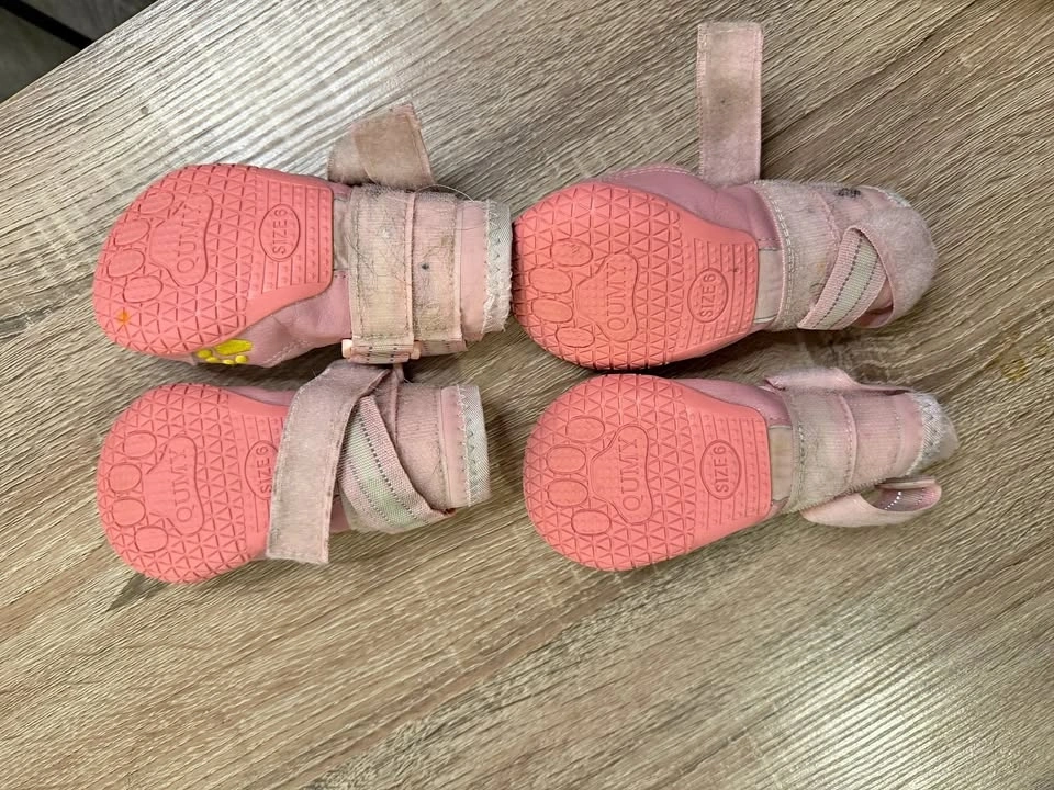 Pink dog boots, 4 units (1 set). Protect against salt, cold, hot pavement, uncertain terrain. Used, but not broken and the velcro works completely fine. Closet clean out!! Check my other listings for clothing and pet items!