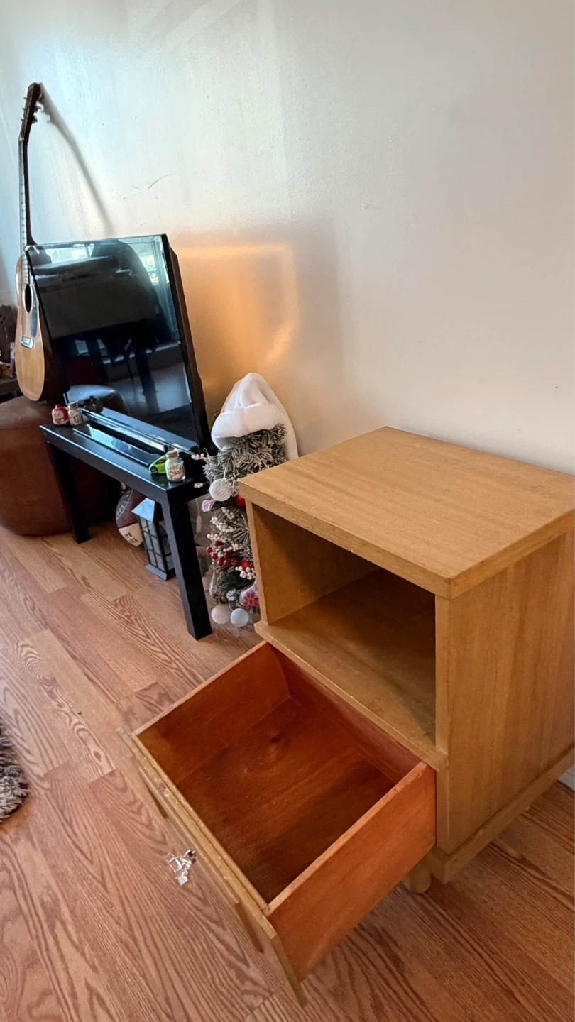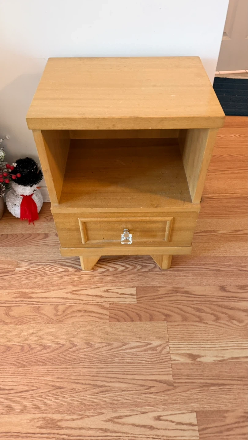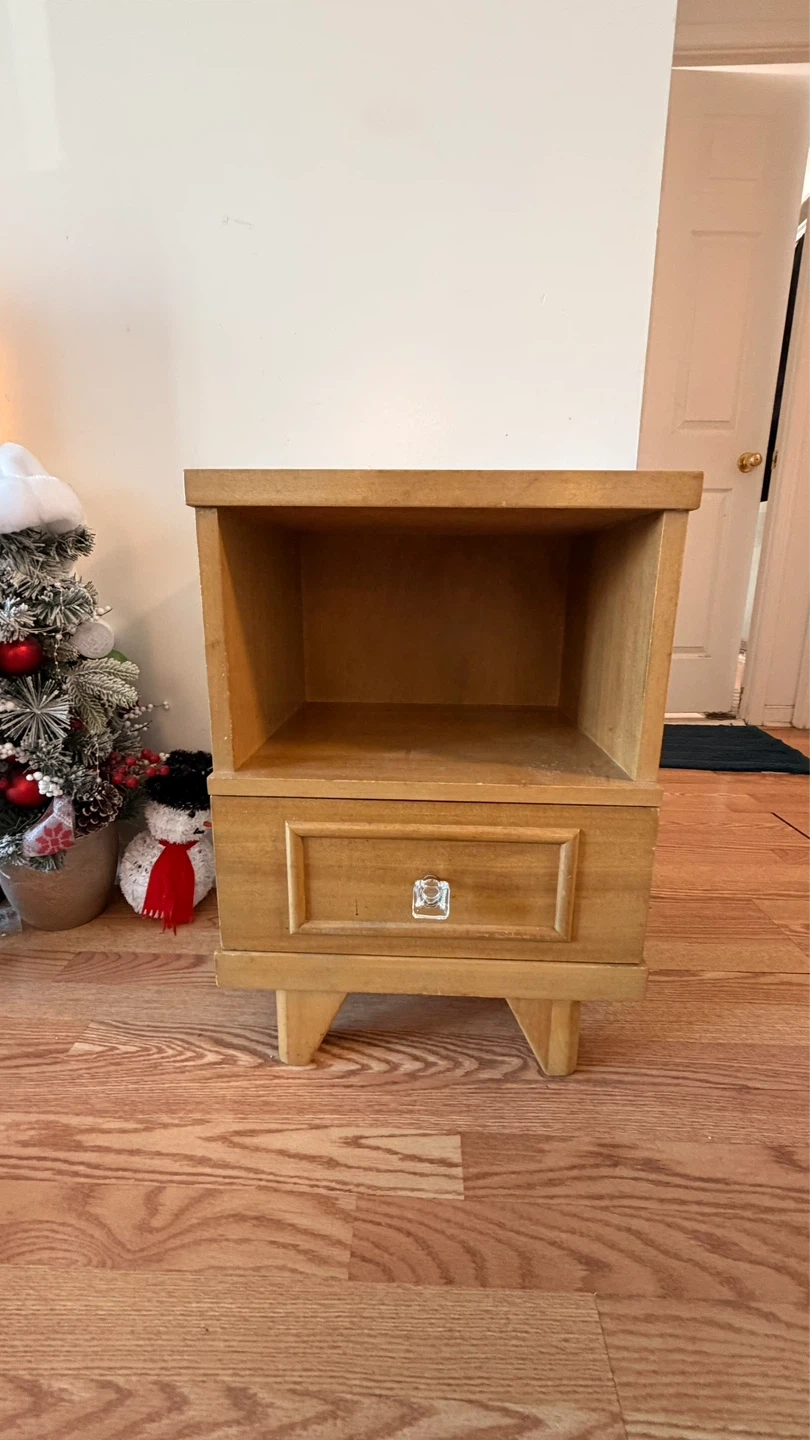 A sturdy wooden nightstand with one drawer and an open shelf. It's made of light wood with a clear knob. Perfect for storing bedside essentials!