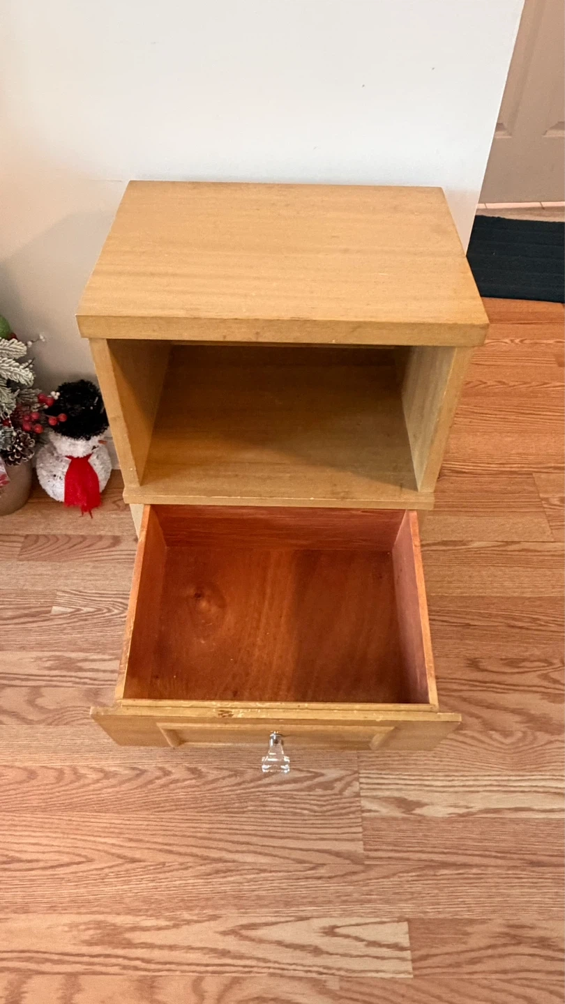 A sturdy wooden nightstand with one drawer and an open shelf. It's made of light wood with a clear knob. Perfect for storing bedside essentials!