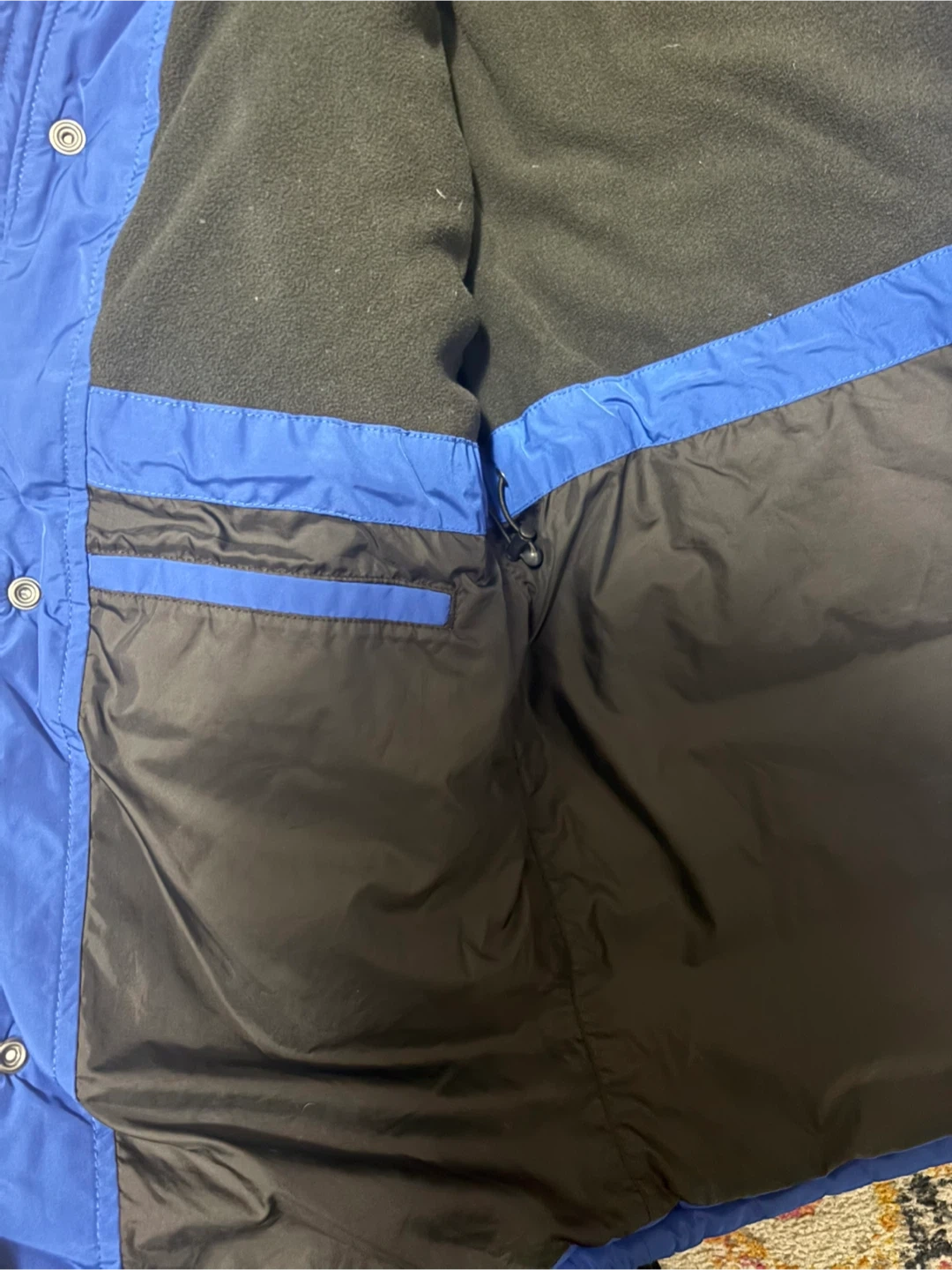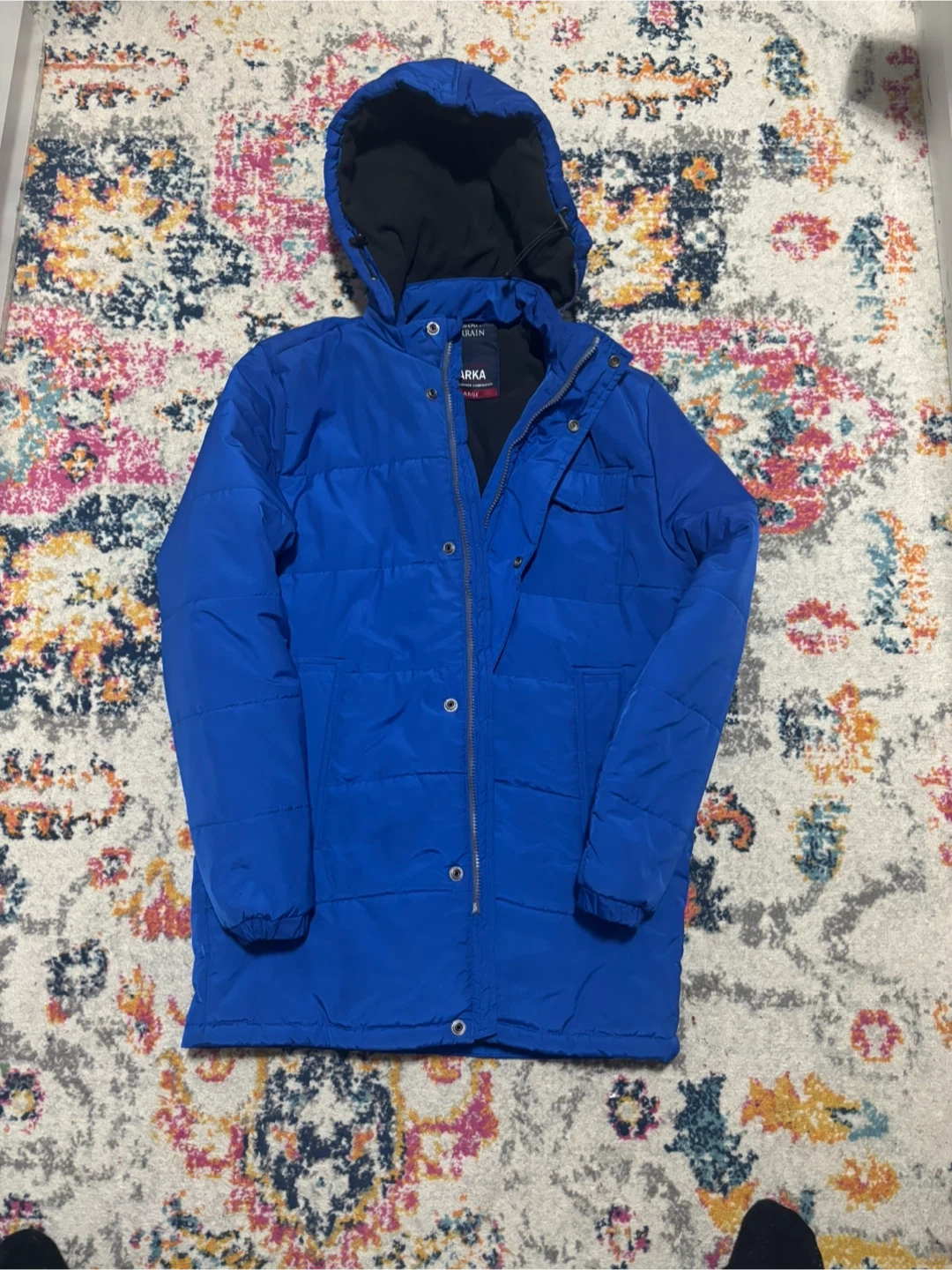 This blue Tech + Terrain parka is a cold weather companion. It's a size large with a fleece lining inside. Zips up the front.