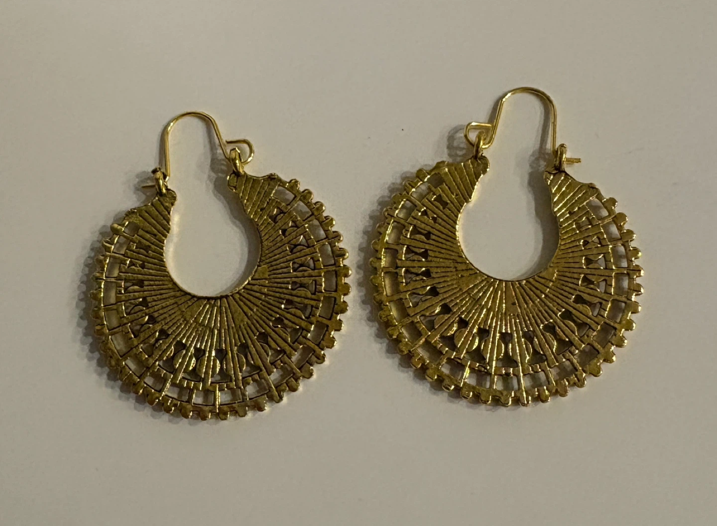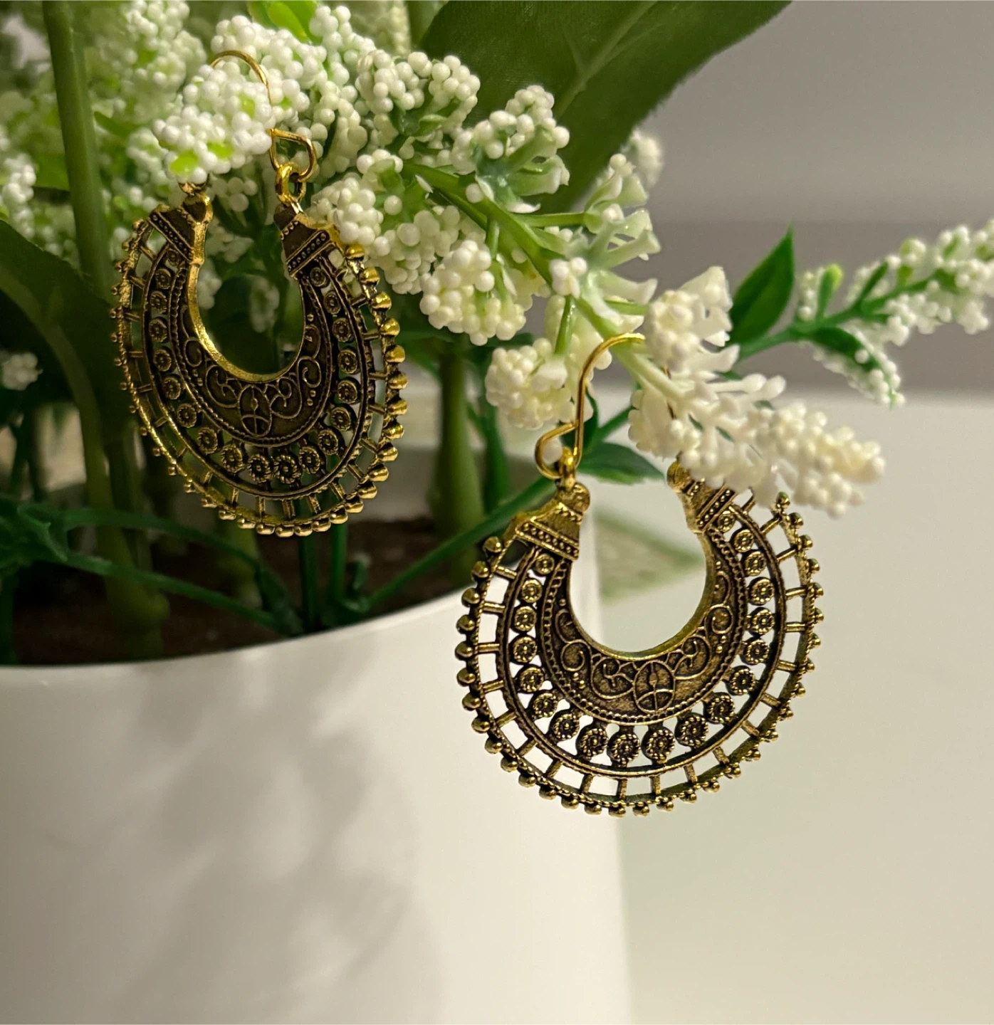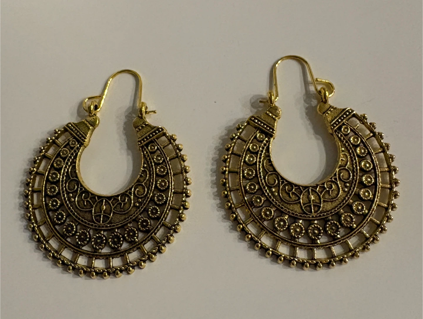 Gorgeous gold-tone hoop earrings with an intricate filigree design. These earrings are lightweight and feature a hook backing for easy wear. They're sure to add a touch of elegance to any outfit!