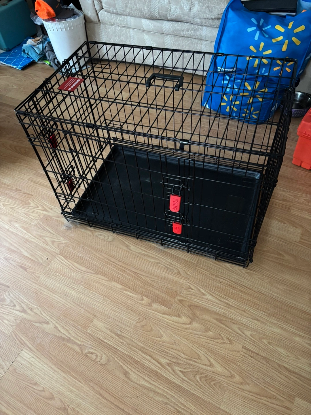 Black metal dog crate. Includes removable plastic tray. Great for travel or home use. Folds flat for easy storage. 30"L x 19"W x 21"H barely used a week.