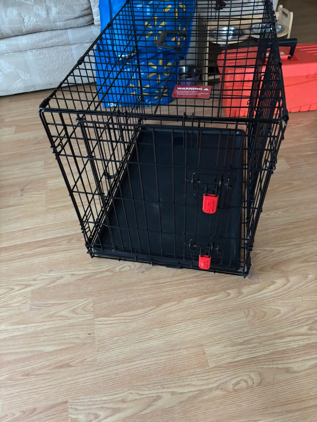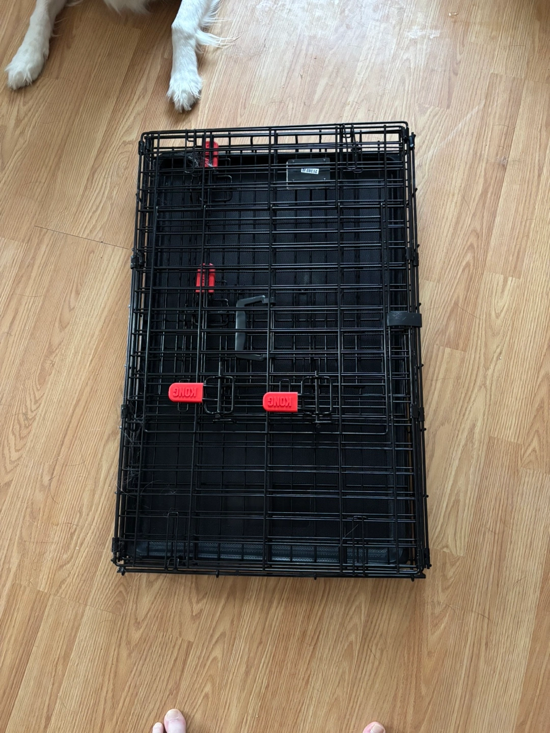 Black metal dog crate. Includes removable plastic tray. Great for travel or home use. Folds flat for easy storage. 30"L x 19"W x 21"H barely used a week.