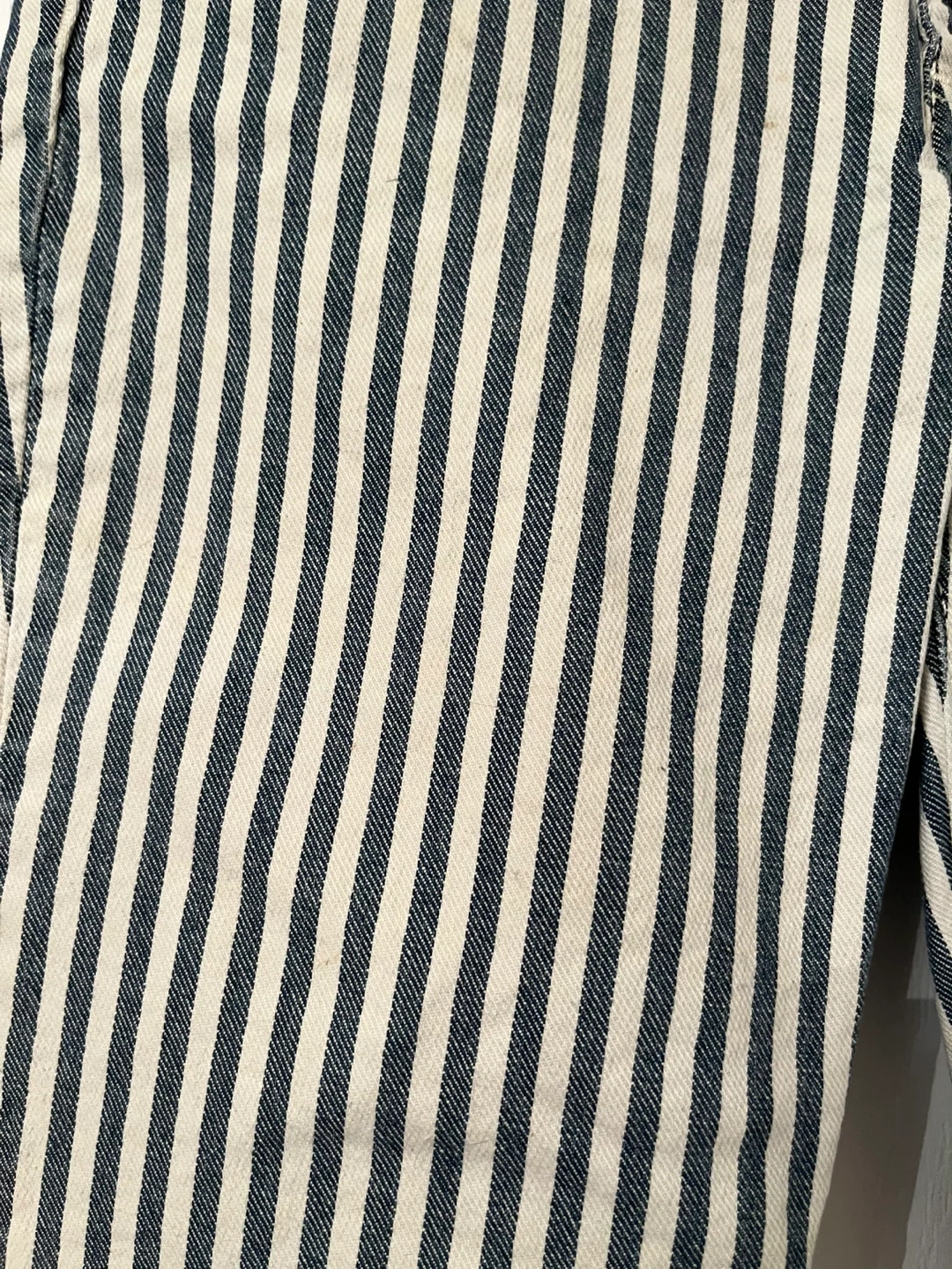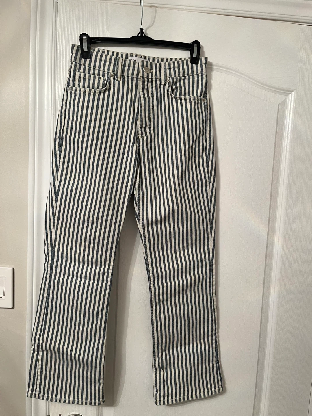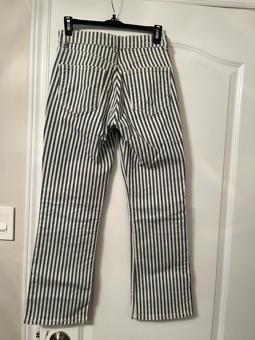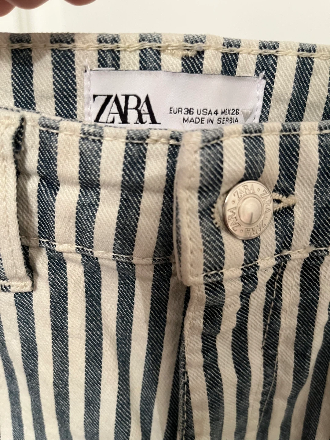 These Zara jeans feature a classic pinstripe pattern in white and dark blue. They're a size EUR 36, which corresponds to a US size 4. Made in Serbia. These jeans would be a great addition for someone looking for a statement piece to liven up their wardrobe!