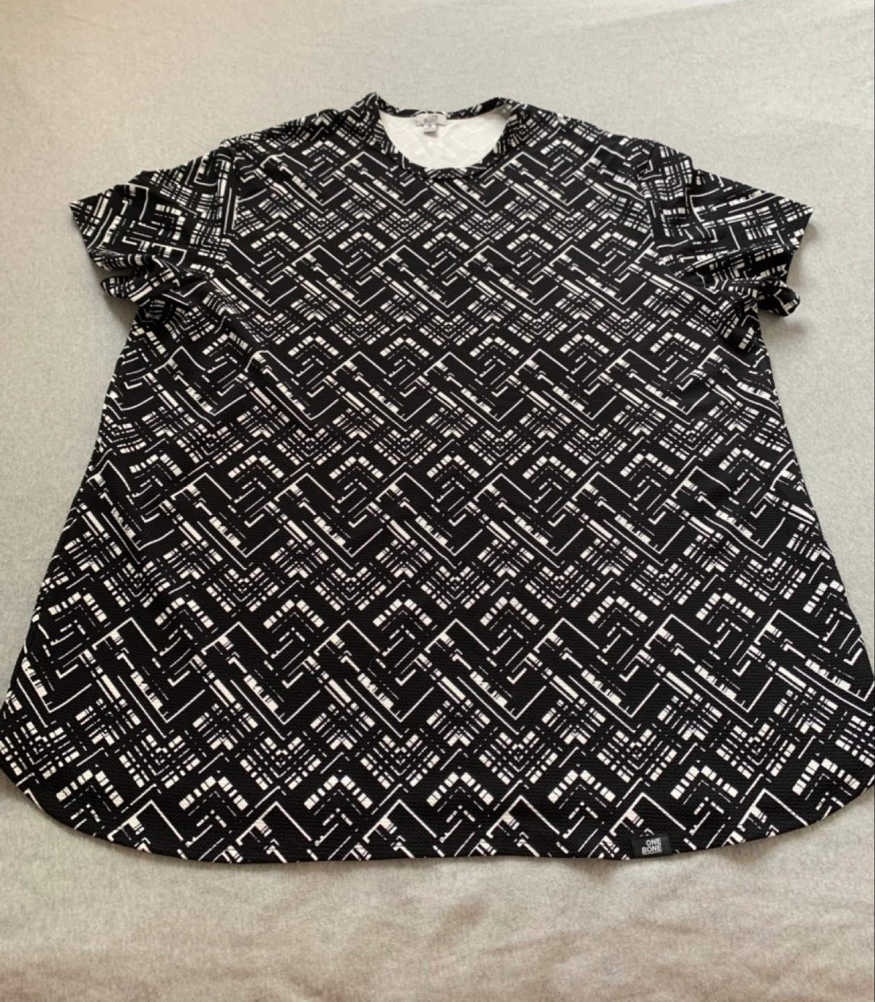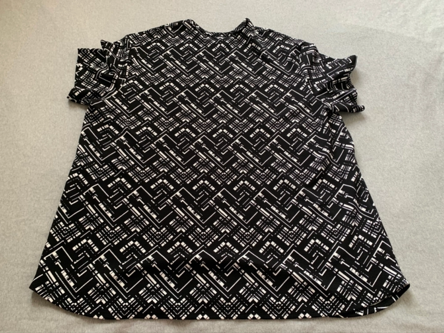 Black and white geometric print. Short sleeves. Round neckline. Relaxed fit.