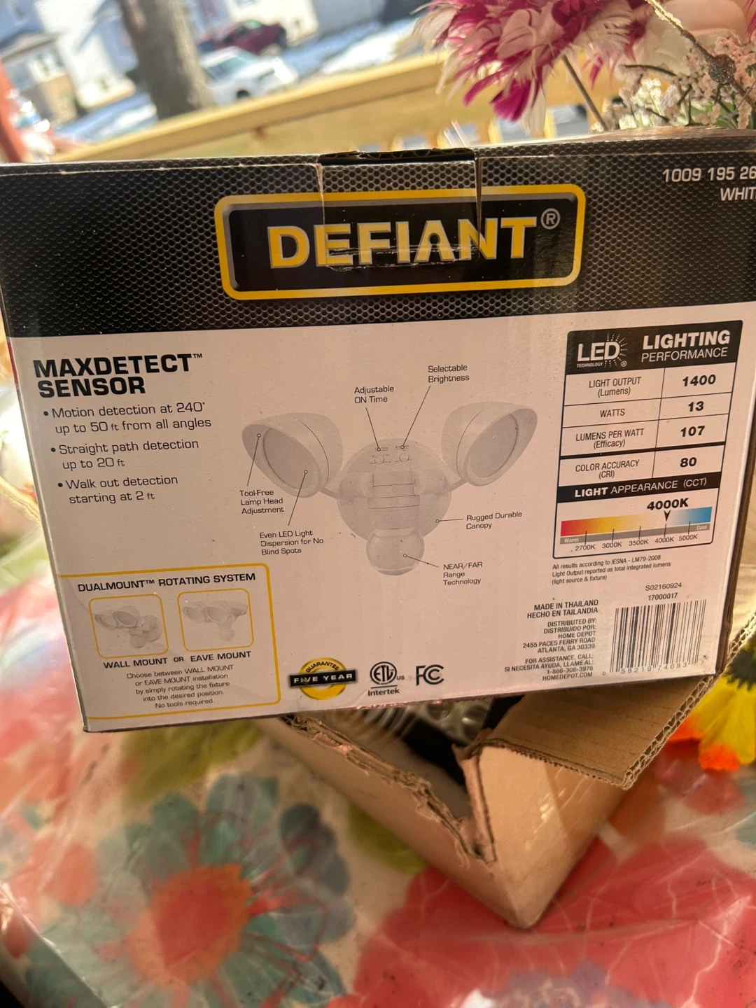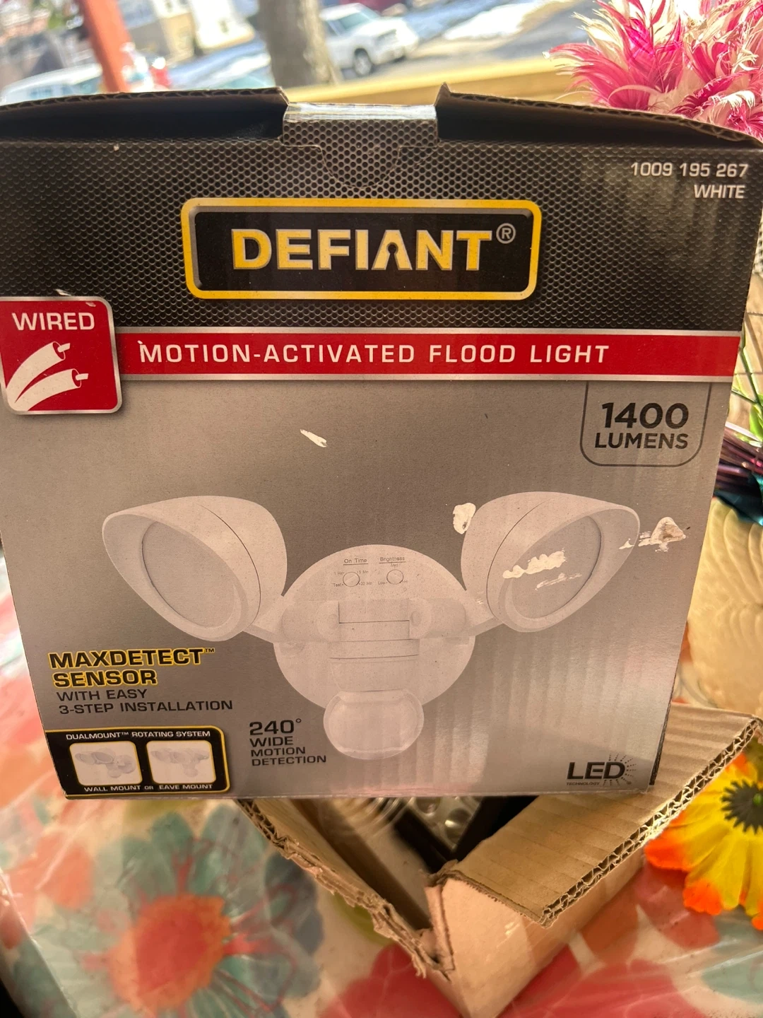 Selling a Defiant MaxDetect Sensor motion-activated flood light. It features 240° wide motion detection up to 50 ft from all angles. The light output is 1400 lumens and the light appearance is 4000K.