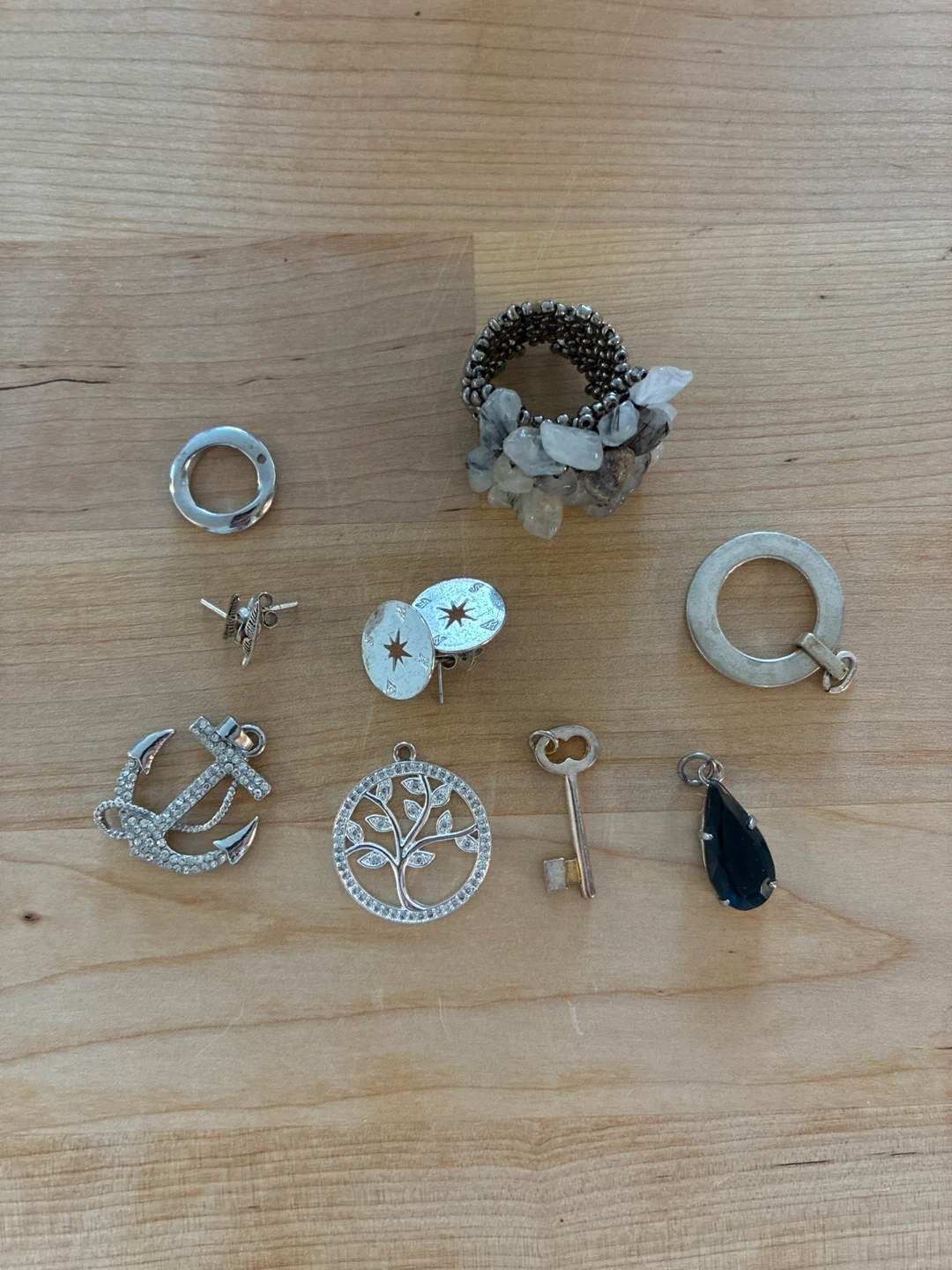 A collection of assorted silver-tone pendants and earrings. Includes an anchor pendant, tree pendant, key pendant, teardrop pendant, a ring, a stone ring and a pair of star earrings and feather earrings.