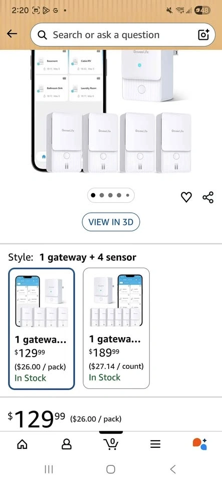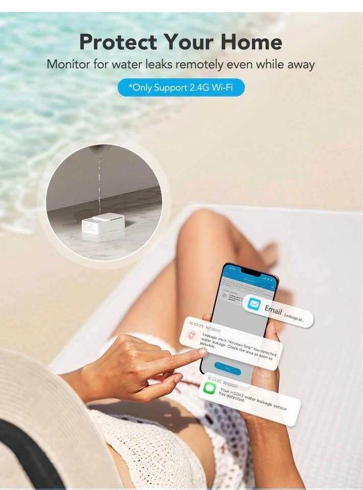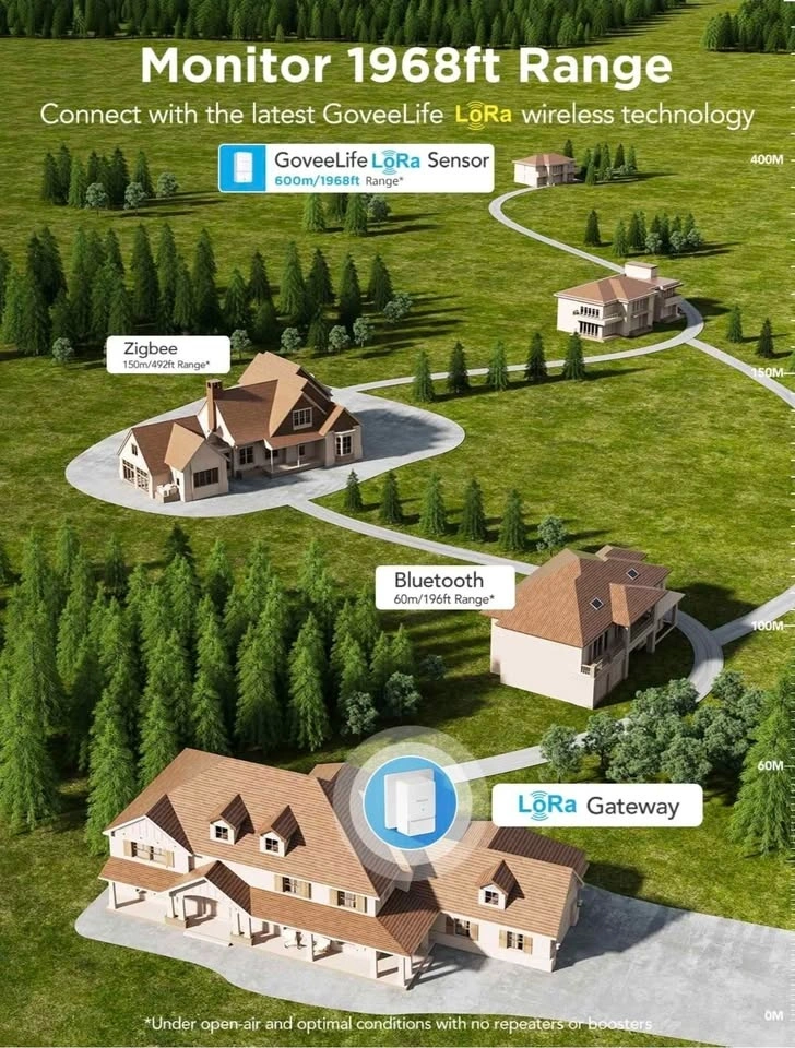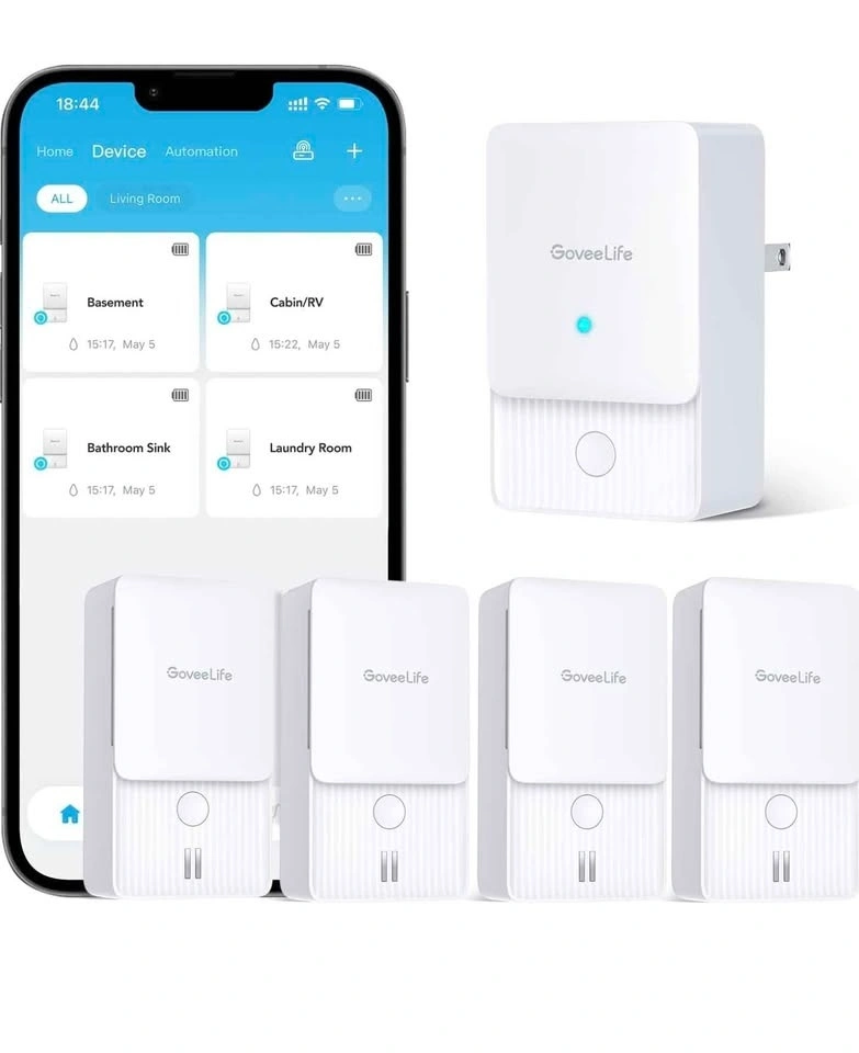 Smart GoveeLife water leak detector kit. Comes with 1 gateway and 4 sensors. Super easy to set up and monitors for water leaks remotely. Get alerts on your phone or email. Has 5-year battery life and a long 600m (1968ft) support distance. Connects using 2.4G Wi-Fi, LoRa, and Bluetooth. Can support up to 100 sensors. Keep your home safe from water damage!