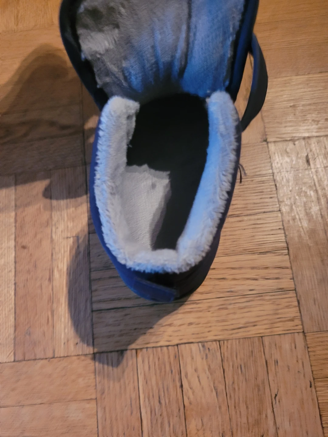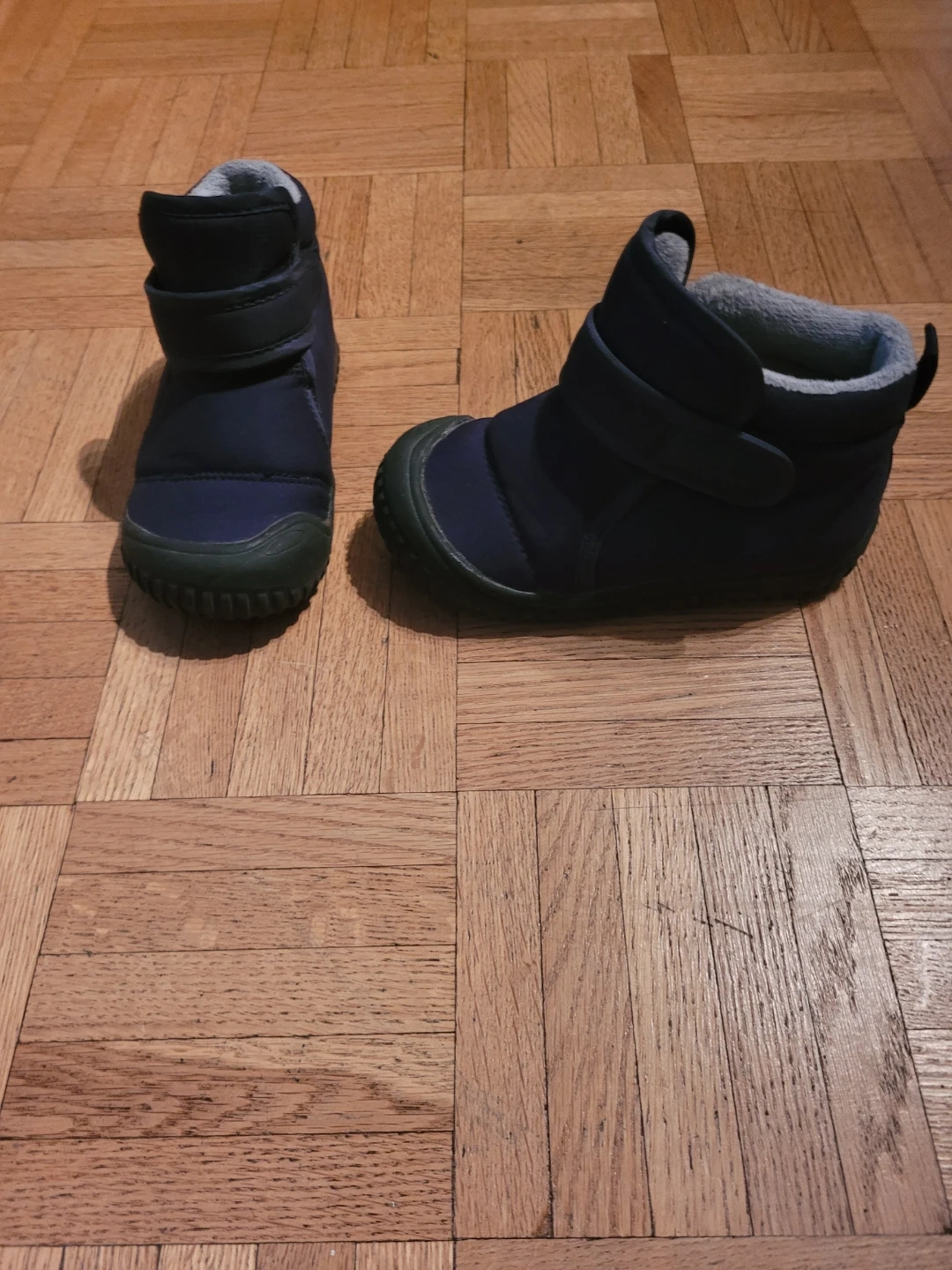 These are a pair of navy blue boots. They feature a velcro strap and a soft, plush lining to keep little feet warm and cozy during the colder months. The size is toddler 8.