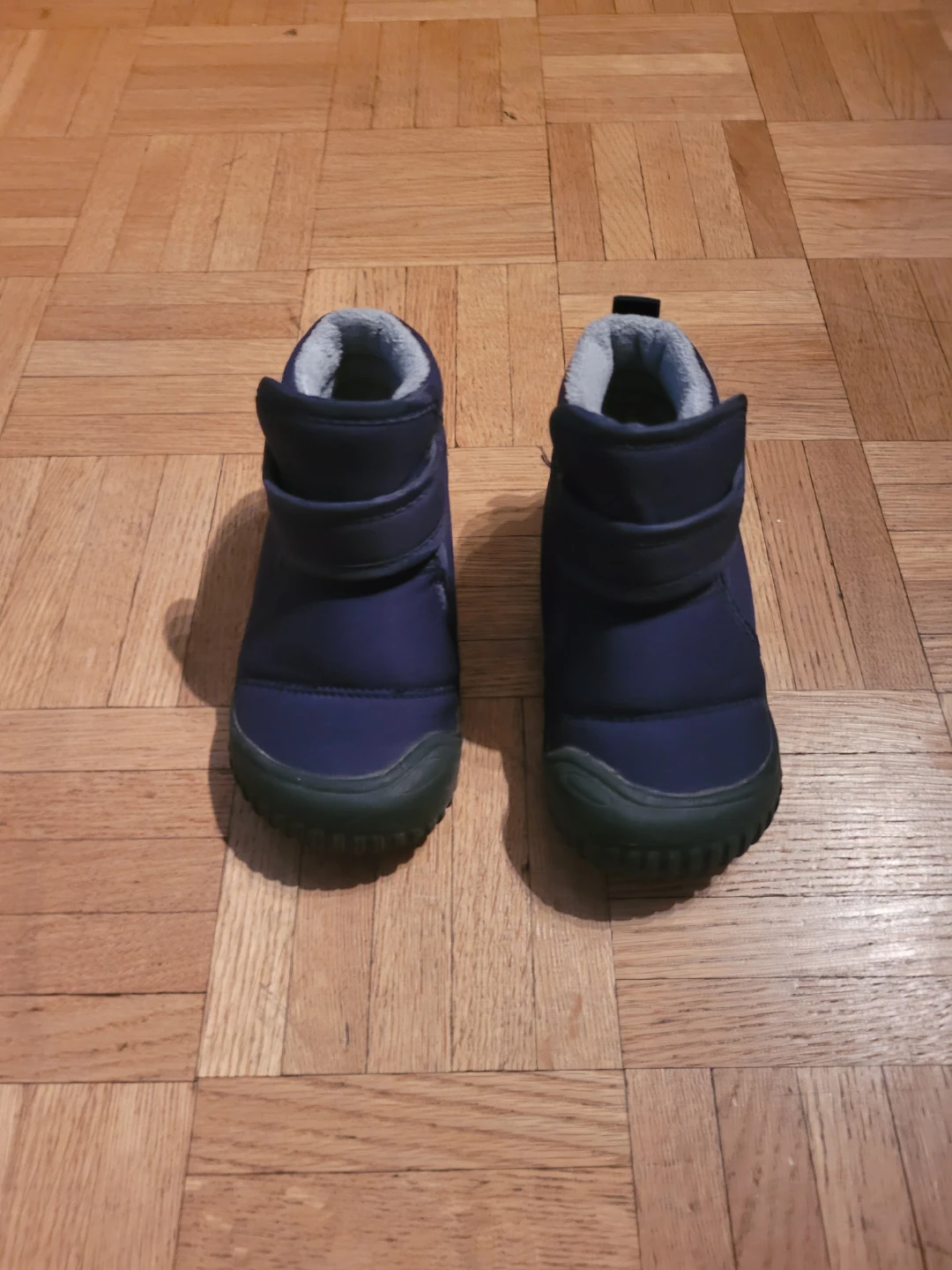 These are a pair of navy blue boots. They feature a velcro strap and a soft, plush lining to keep little feet warm and cozy during the colder months. The size is toddler 8.