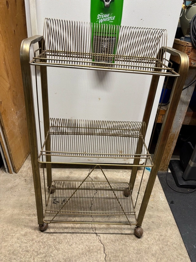This is a vintage, metal record holder cart with three tiers, perfect for storing and displaying your vinyl collection. Given its age, it has some wear but is in good condition. Features three-tier storage, metal construction, and wheels for easy movement. Looking at similar items sold on Kijiji, a fair price for this record holder cart would be around $100. If the ad is up, it's available—no need to ask! Happy collecting!