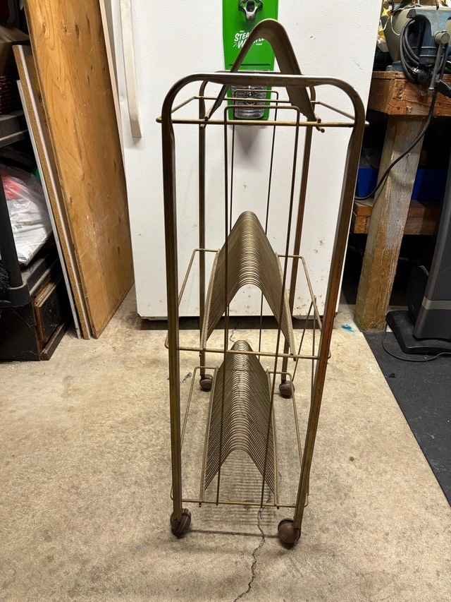 This is a vintage, metal record holder cart with three tiers, perfect for storing and displaying your vinyl collection. Given its age, it has some wear but is in good condition. Features three-tier storage, metal construction, and wheels for easy movement. Looking at similar items sold on Kijiji, a fair price for this record holder cart would be around $100. If the ad is up, it's available—no need to ask! Happy collecting!