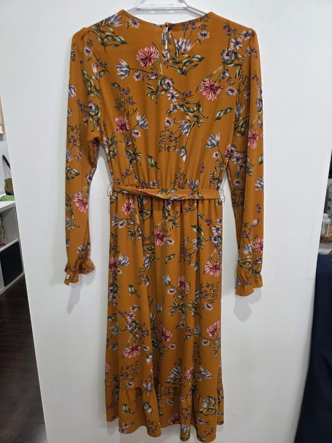 This stylish midi dress features a beautiful all-over floral print on a mustard-yellow background. It has long sleeves with elastic cuffs and a matching tie belt to cinch the waist. The flowy skirt adds a lovely silhouette. It's perfect for a casual outing or a nice dinner!