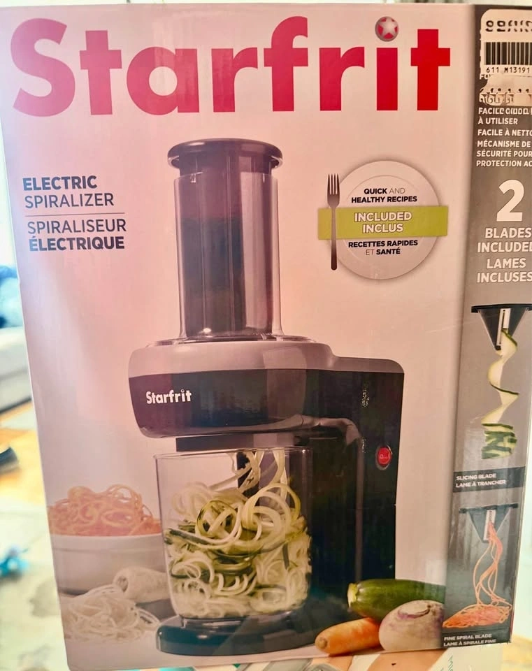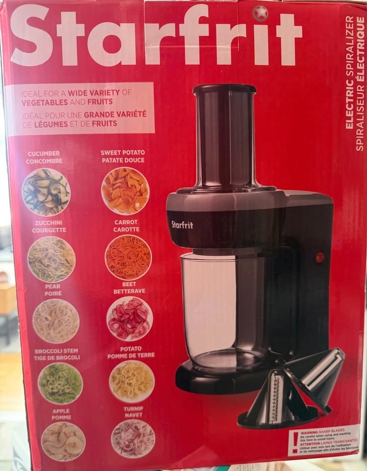 BNIB The new Starfrit Electric Spiralizer is your solution to healthy eating - introduce a wide variety of vegetables and fruits to your meals - with a twist! The Starfrit electric Spiralizer is the perfect appliance to transform your vegetables and fruits into spiral or ribbon cuts - effortlessly! With the 2 blades included, the possibilities are endless. Insert the vegetables/fruits into the chute using the food pusher and let the blade do the rest. The result is consistent cuts in just seconds! The electric Spiralizer is designed with your safety in mind, the blades are never exposed while in use and the integrated safety mechanism prevents the blade from turning if the chute is not securely locked in. Recipes are included to help you discover countless ways to use the Starfrit electric Spiralizer. 2 interchangeable stainless steel blades : fine circle blade & slicing blade. Detachable parts for easy cleaning, dishwasher safe. Compact design convenient for easy storage. Safe - No blades exposed and safety mechanism for added safety. Quick and easy to use, ideal for a wide variety of vegetables. Less waste than traditional manual spiralizer. 60 Watts. Recipes included.