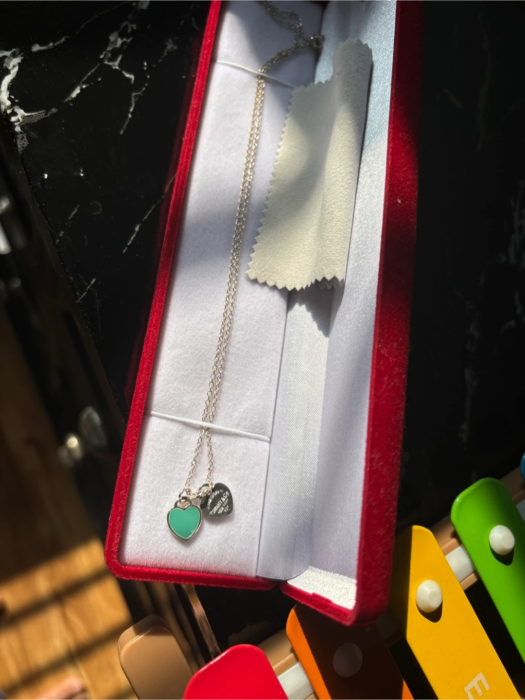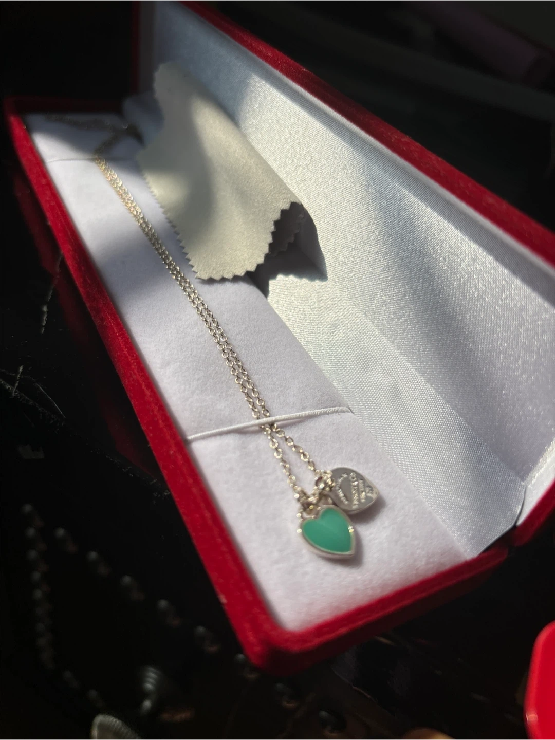 This is a Tiffany & Co. sterling silver necklace with a heart tag charm. It features a signature turquoise-coloured heart pendant. Includes original box and polishing cloth.
