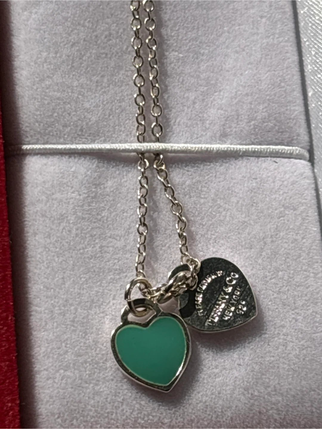 This is a Tiffany & Co. sterling silver necklace with a heart tag charm. It features a signature turquoise-coloured heart pendant. Includes original box and polishing cloth.