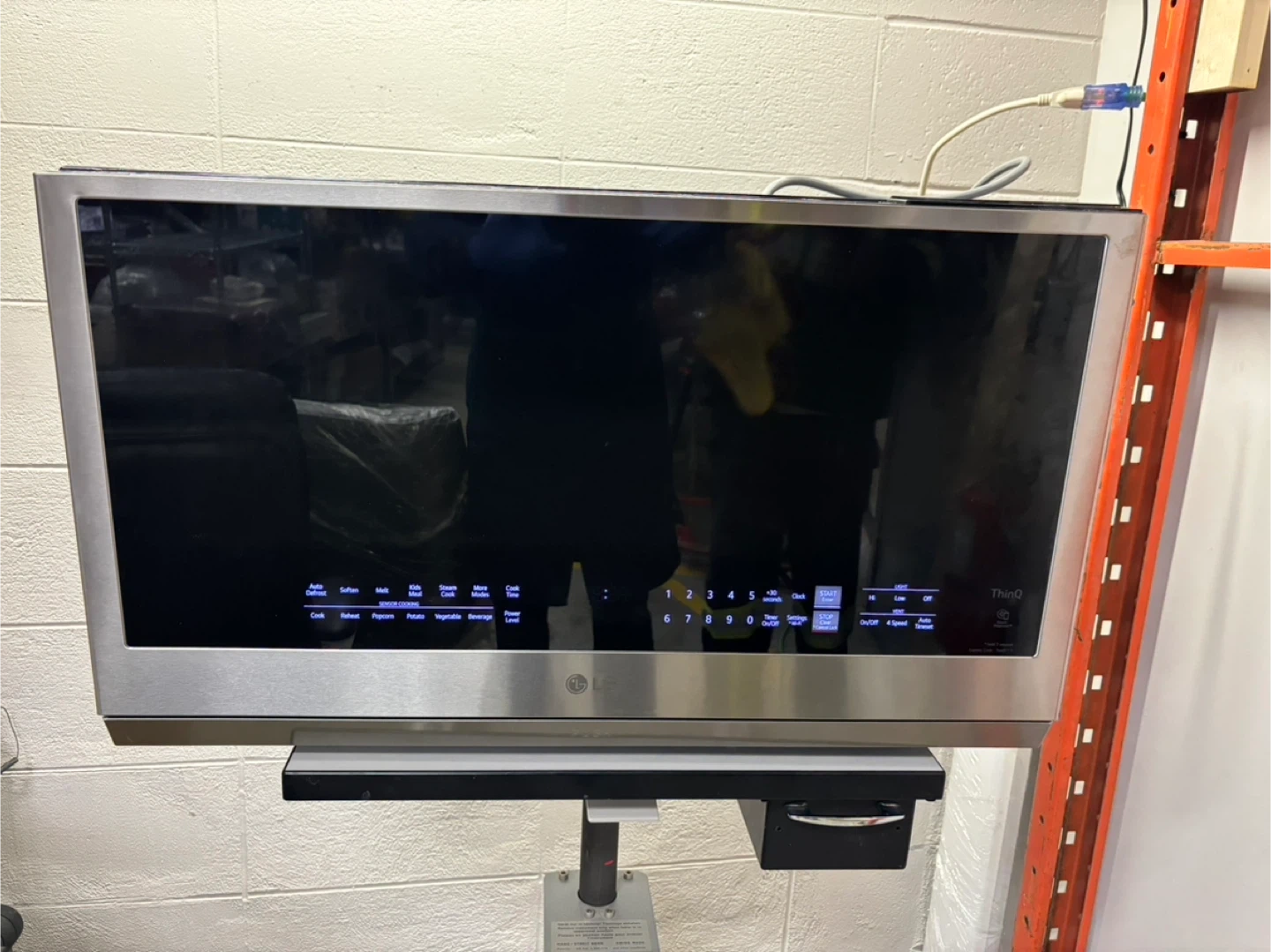 This is an LG ThinQ microwave. It has a sleek stainless steel and black finish. It features a glass turntable and a digital control panel with various cooking presets.