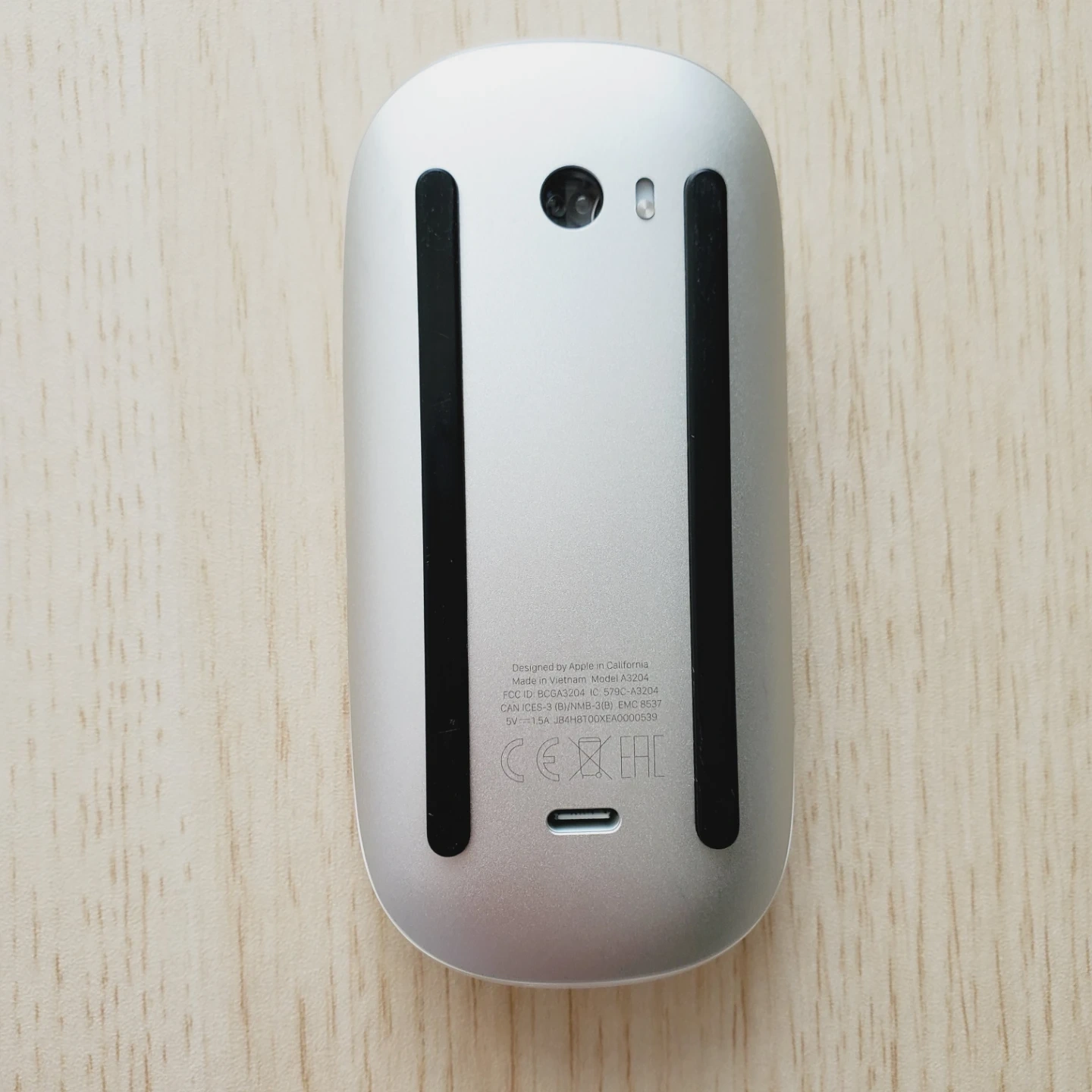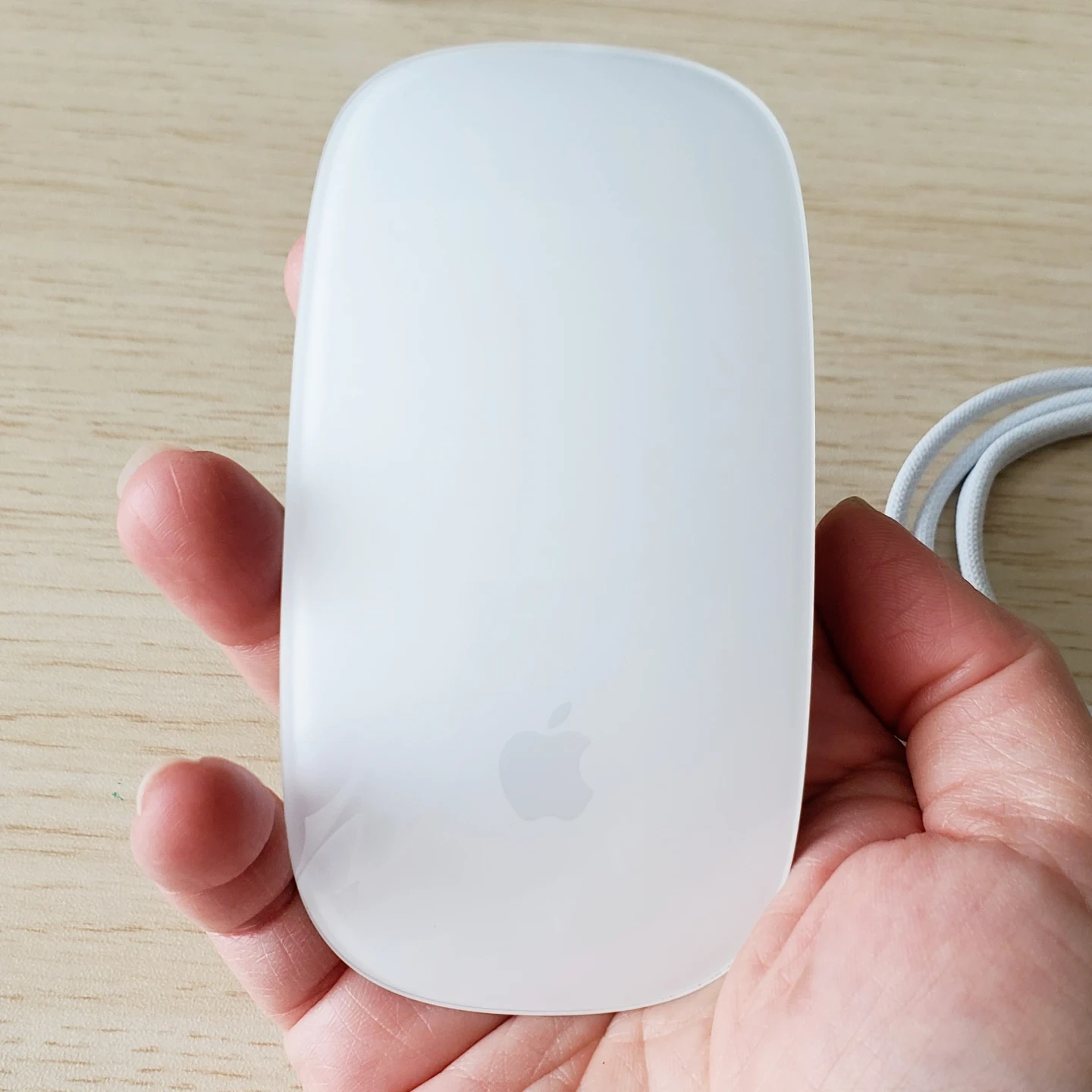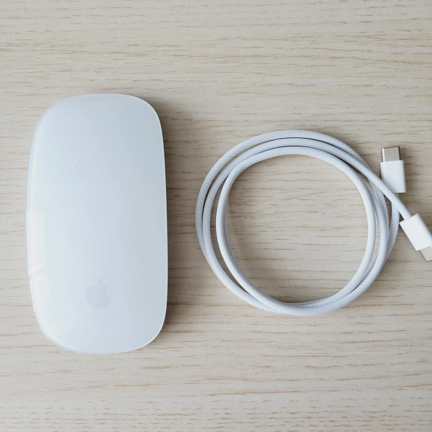 This is an Apple Magic Mouse from 2025. It's a rechargeable wireless mouse with a multi-touch surface. It comes with a braided USB-C to Lightning cable for charging. This mouse offers a smooth scrolling experience and precise cursor control.