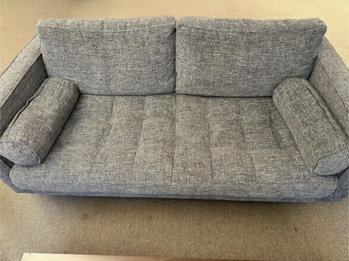 Stylish Article loveseat in a textured grey fabric. Features tufted seat cushions and two bolster pillows. It's 72 inches wide. This loveseat offers comfortable seating for two.
