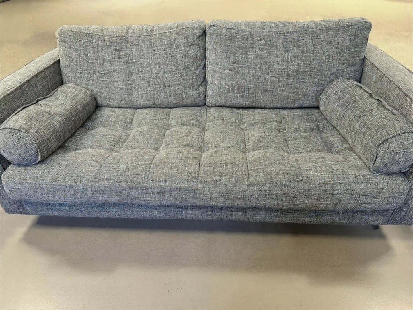 Stylish Article loveseat in a textured grey fabric. Features tufted seat cushions and two bolster pillows. It's 72 inches wide. This loveseat offers comfortable seating for two.