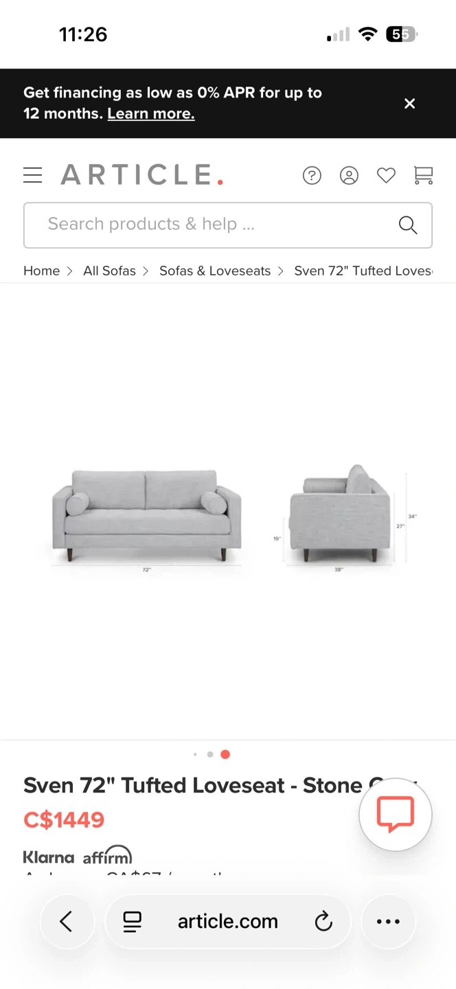 Article Sven 72" Tufted Loveseat - Stone Grey