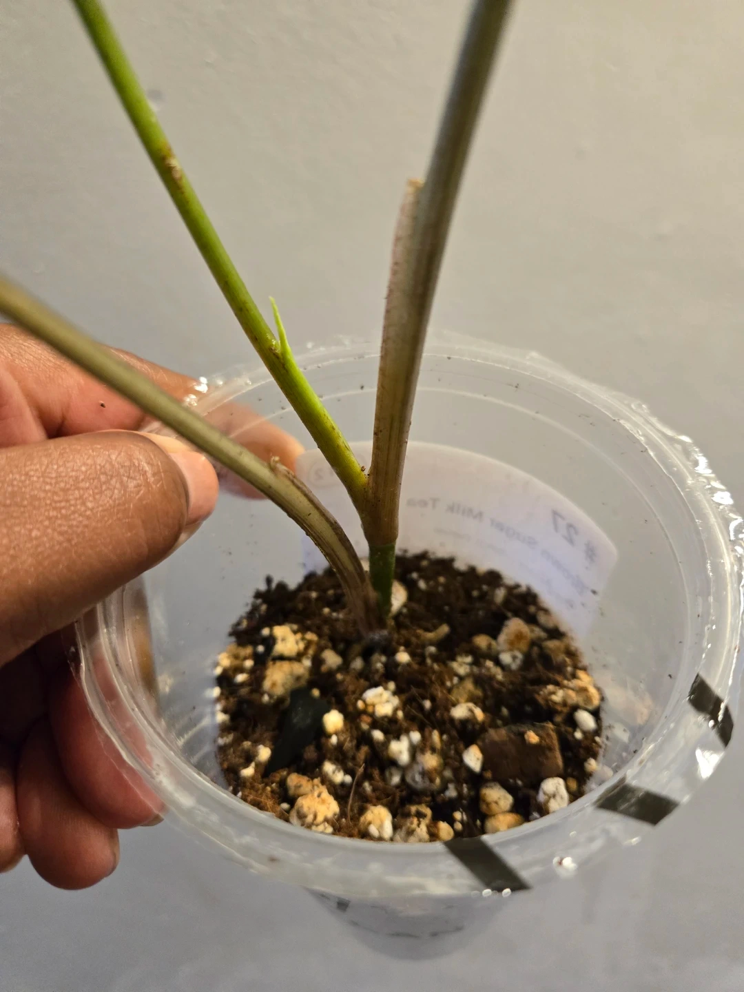 It's potted in a clear plastic cup with soil mix. ✨️🪴