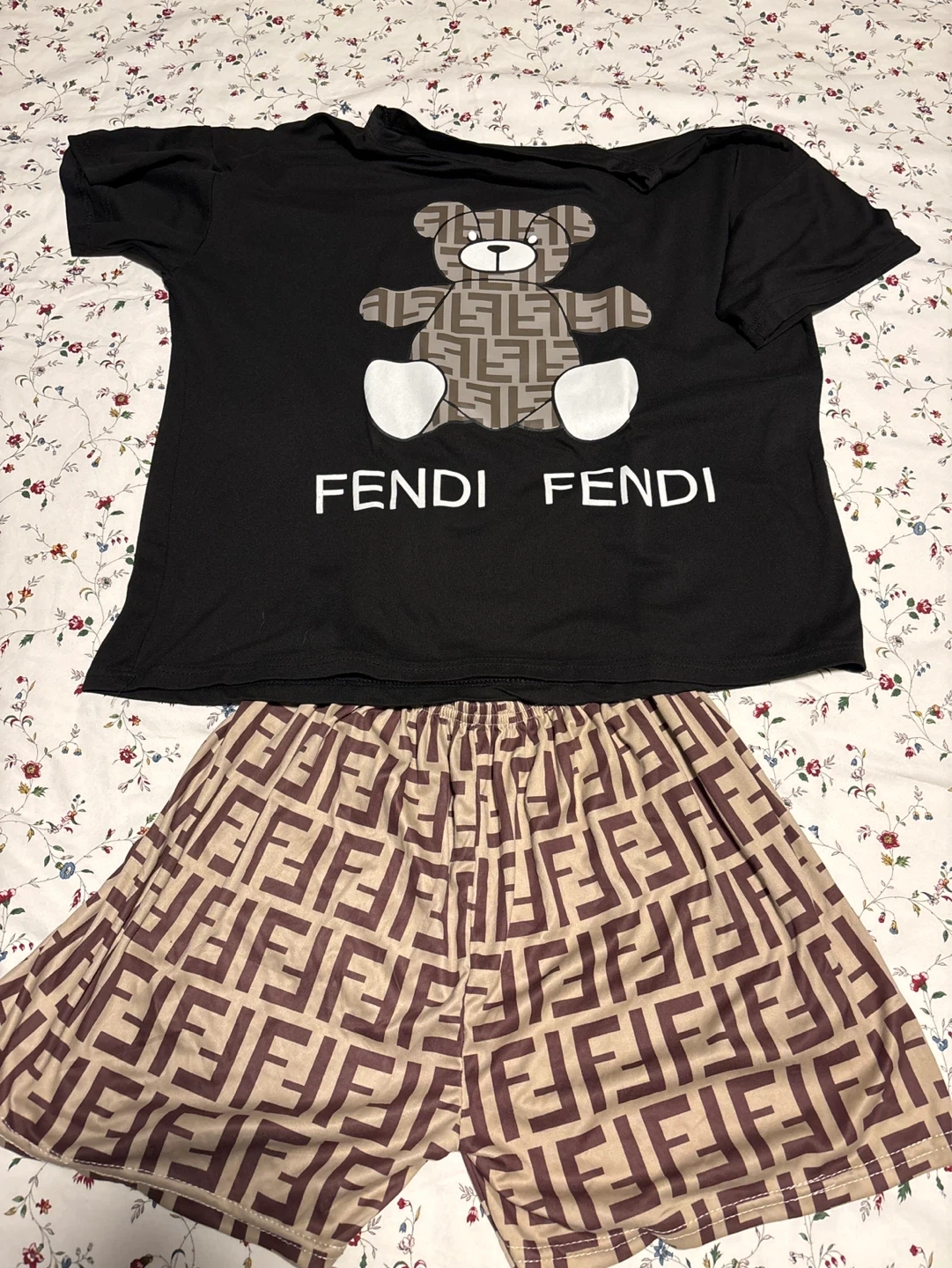 Black t-shirt with a teddy bear graphic and 'FENDI FENDI' text. Matching brown shorts with a repeating 'FF' logo pattern. Cotton blend material. The shorts have a small white stain on the back no clue what it is but overall really good condition