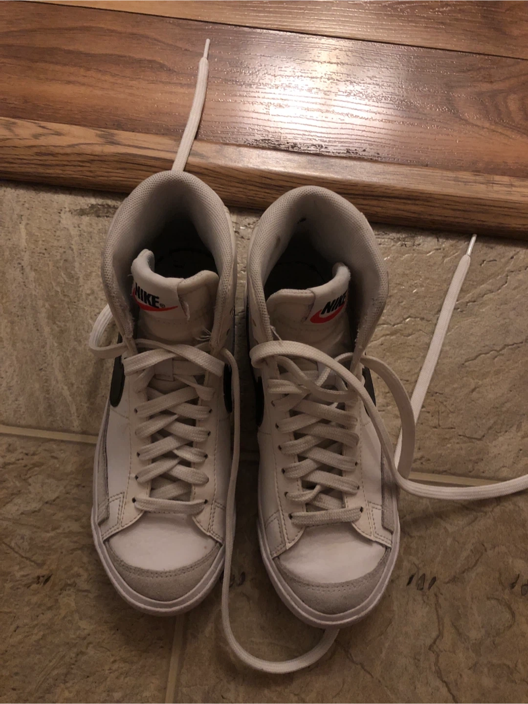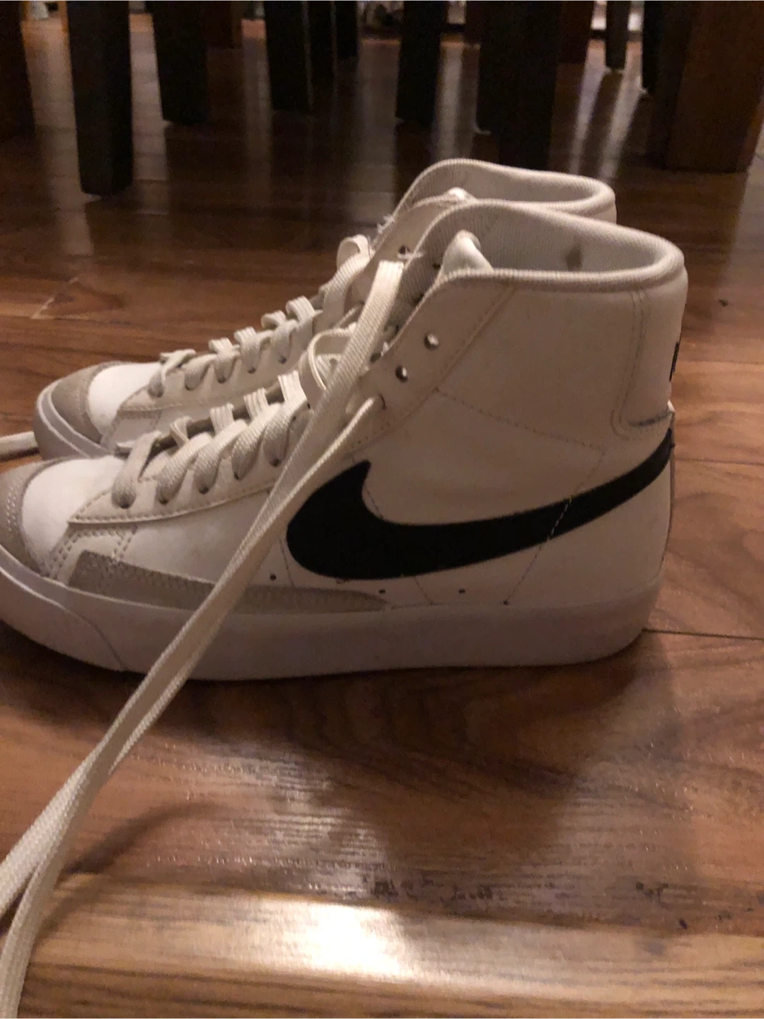 White and black Nike Blazer Mid '77 Vintage high-top sneakers. Classic design with suede accents. Lace-up closure for a secure fit.womens size 3 but is available to males aswell