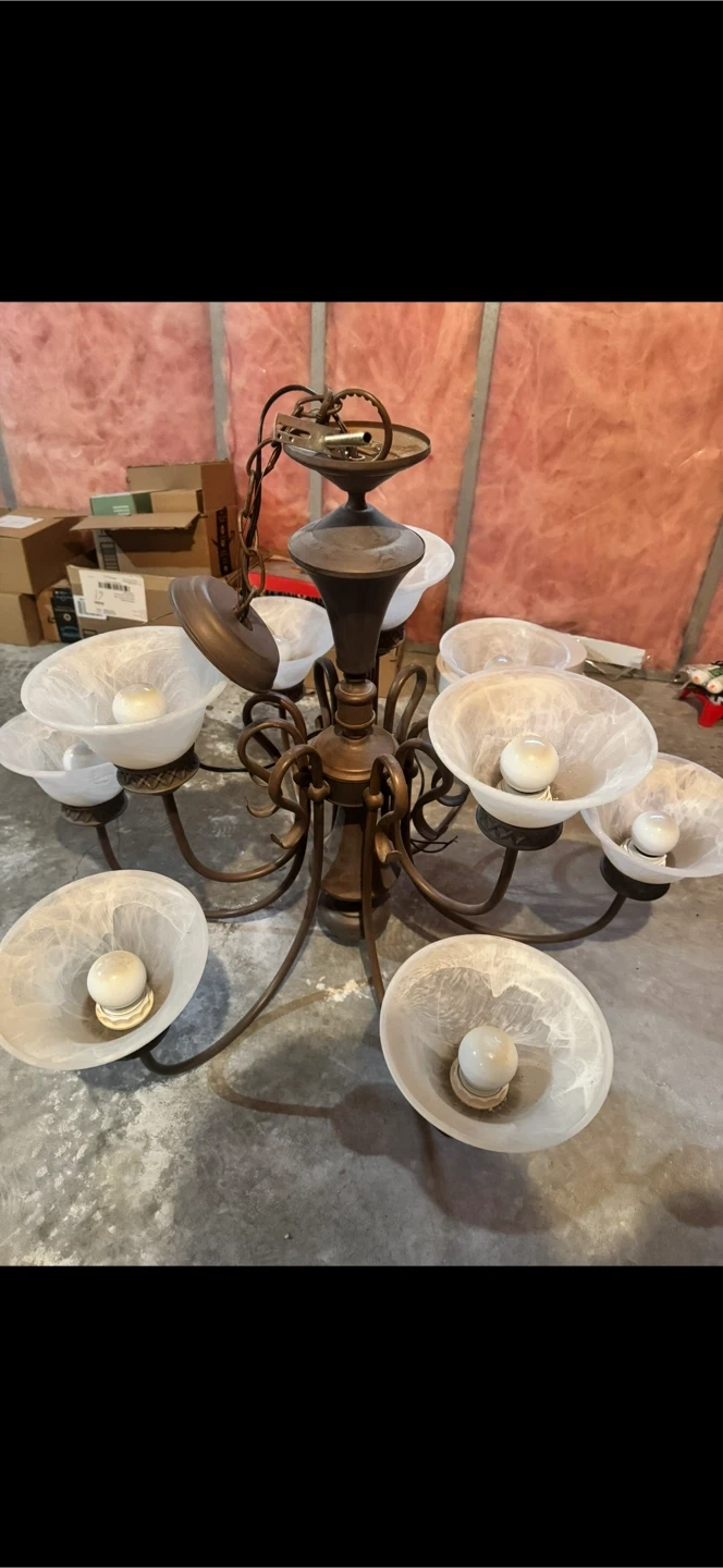 Selling a chandelier with 8 lights. It has a bronze-coloured metal frame and white glass shades. It would be a great addition to any dining room or living room