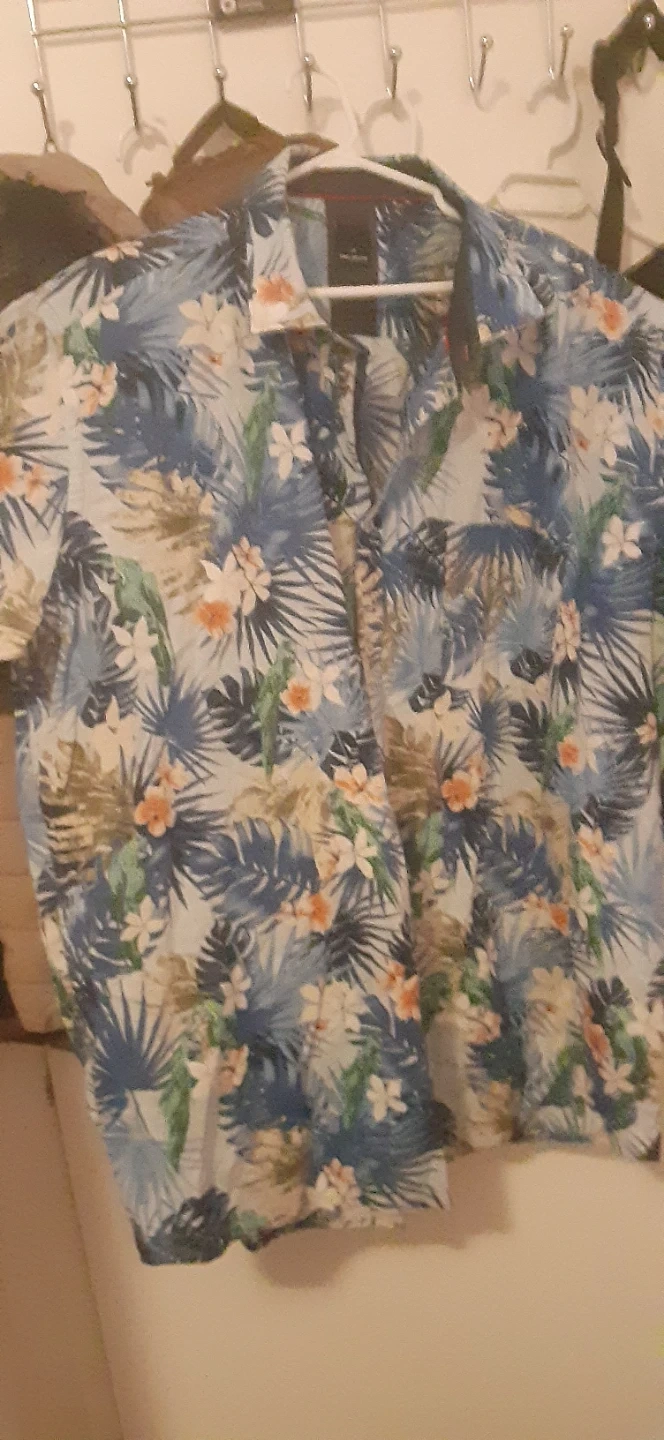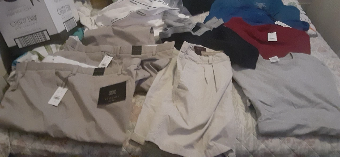 Bundle of men's clothing including Britches khaki pants and various tops. Pants are 100% cotton, wrinkle-free. Tops include a blue polo shirt, red and grey t-shirts, and a black t-shirt.