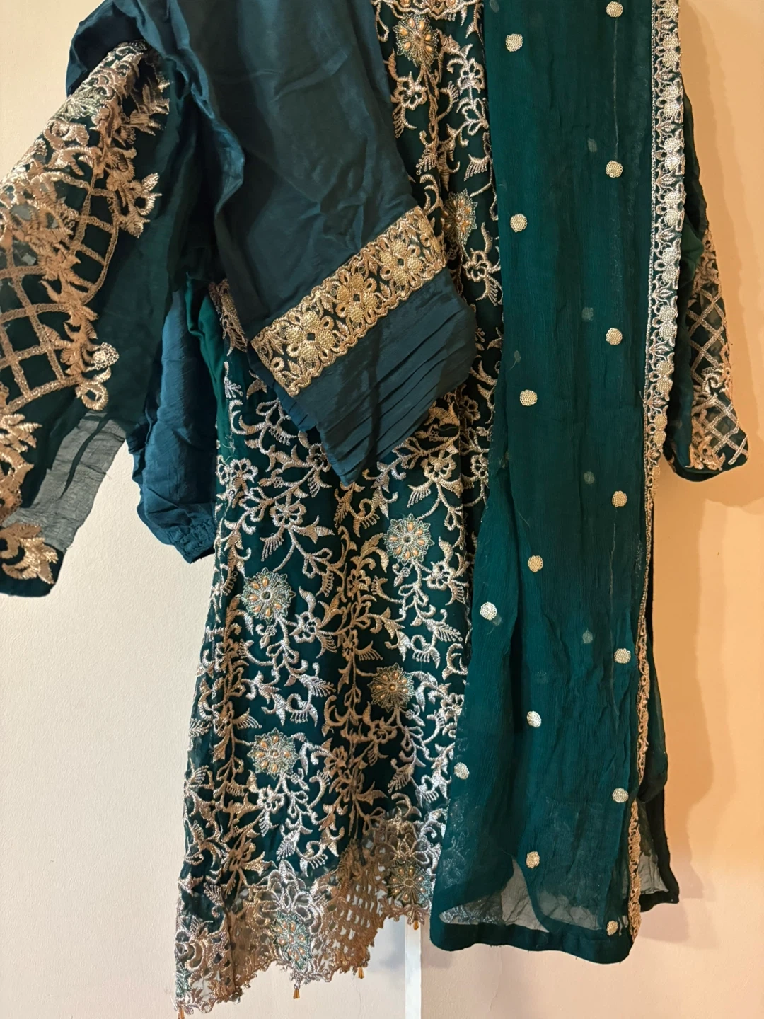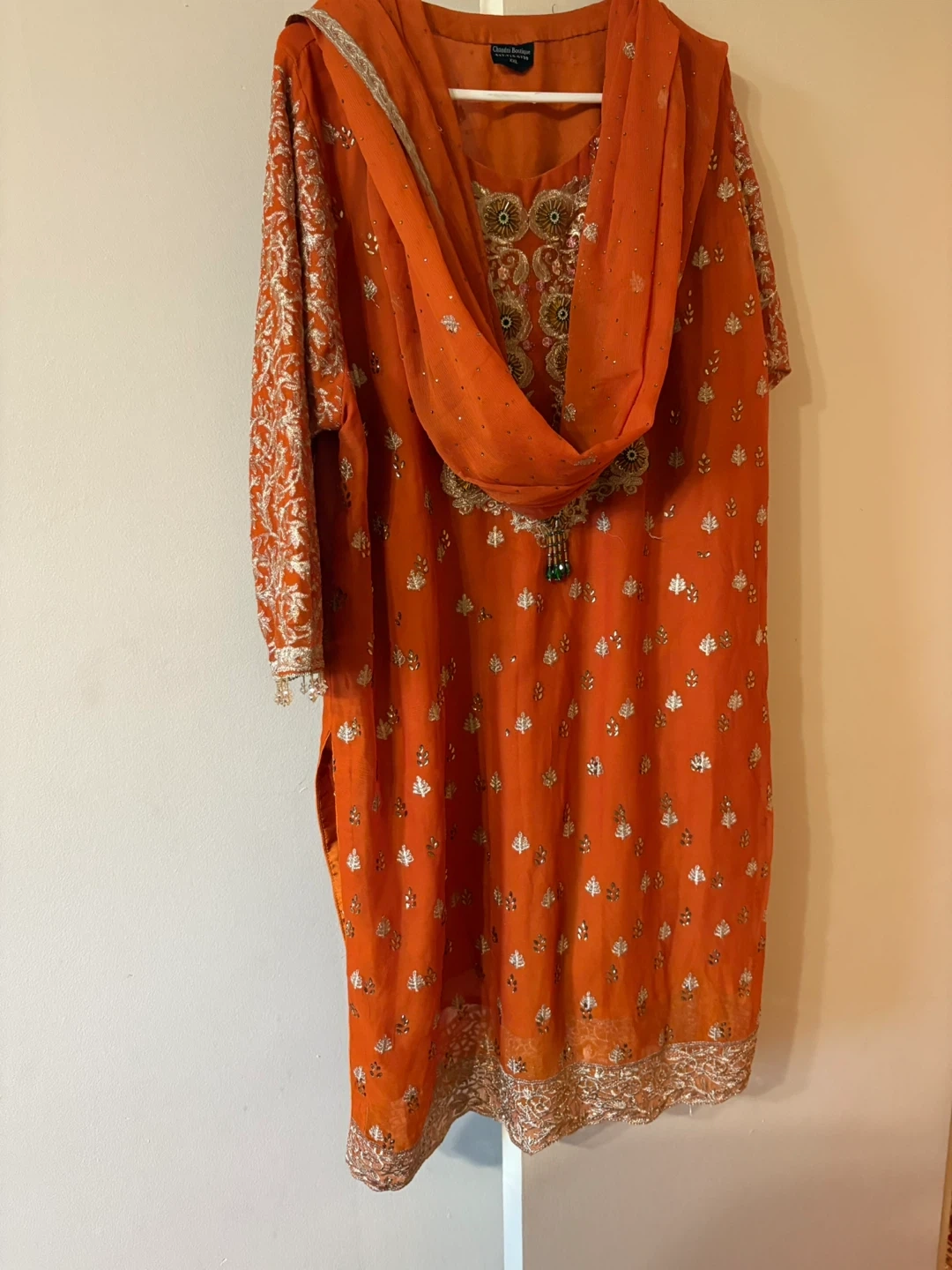 Set of two Pakistani-style dresses, one teal and one orange. Both feature intricate embroidery and come with matching dupattas. Perfect for special occasions!
