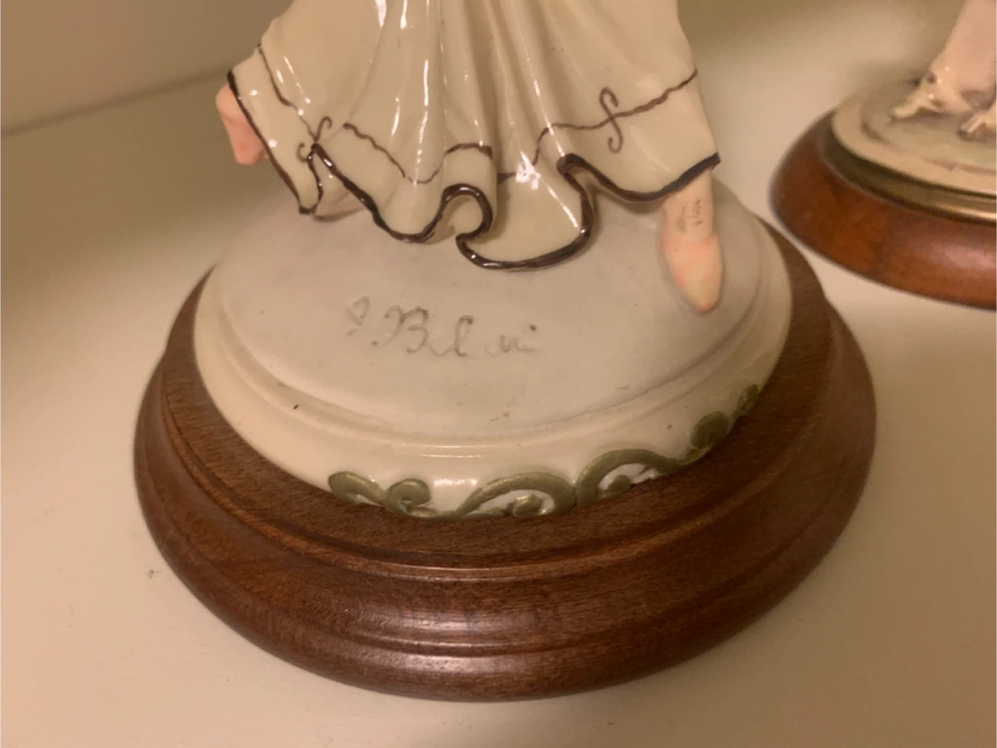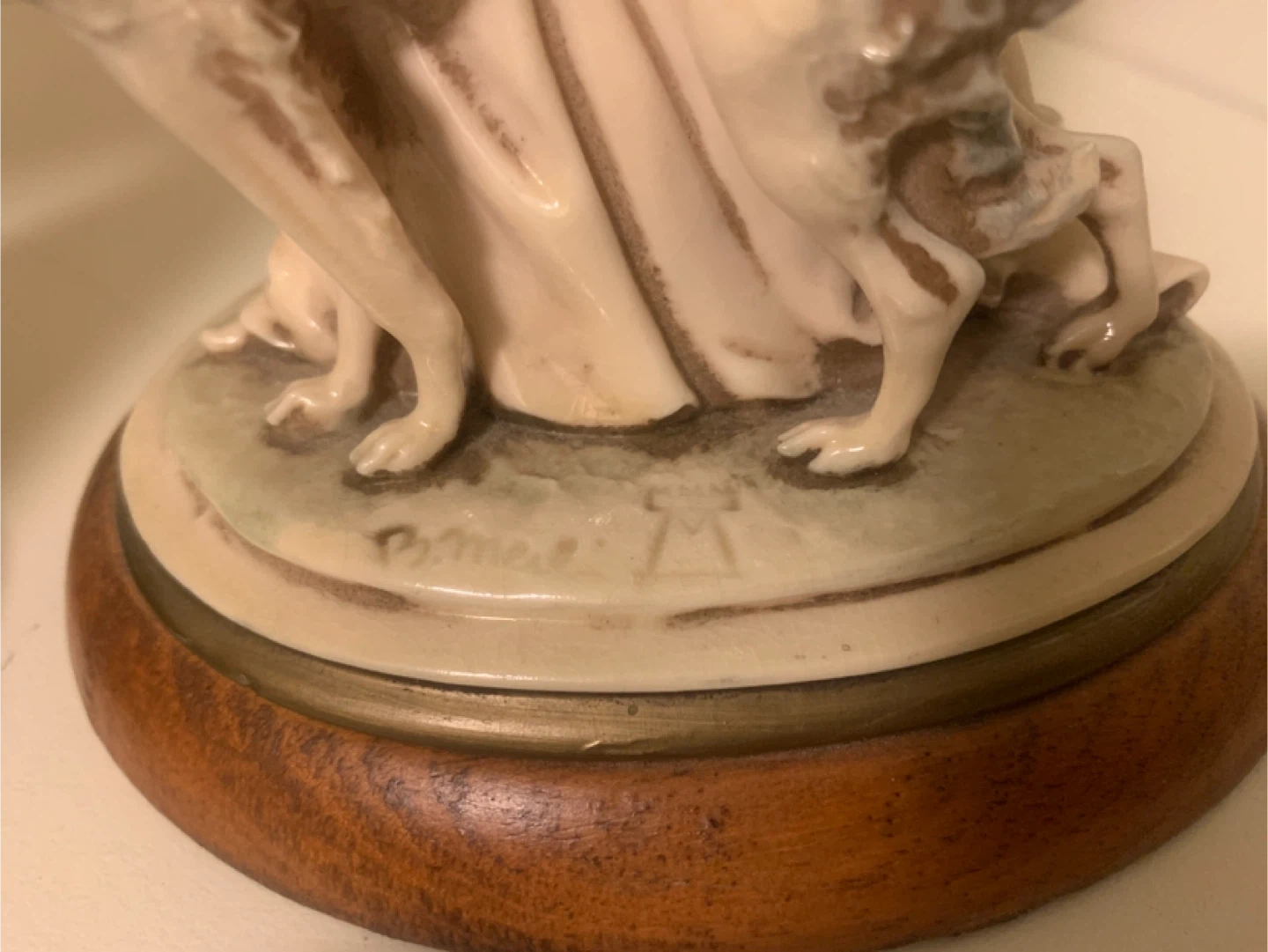 Two detailed figurines depict elegant ladies with dogs, mounted on wooden bases. The piece appears to be signed "P.Bellini" on the base of one figurine. These statues add a touch of vintage charm to any display.