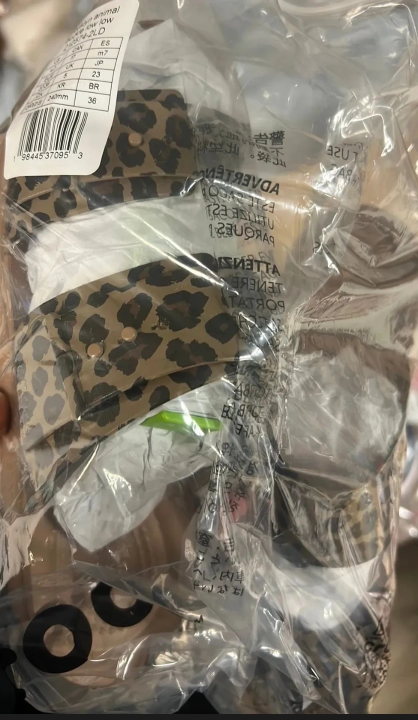 These Crocs Brooklyn Animal Buckle Low Low sandals feature a stylish leopard print. They have adjustable straps with buckles for a secure fit. LiteRide foam footbeds offer comfort.