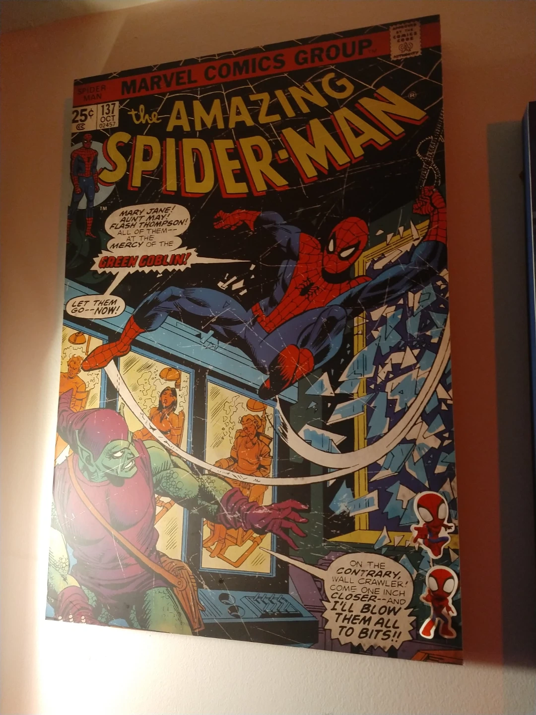 This poster features the iconic Amazing Spider-Man comic book cover, issue 137. It prominently displays Spider-Man in action confronting the Green Goblin. The artwork captures a classic Marvel Comics moment.