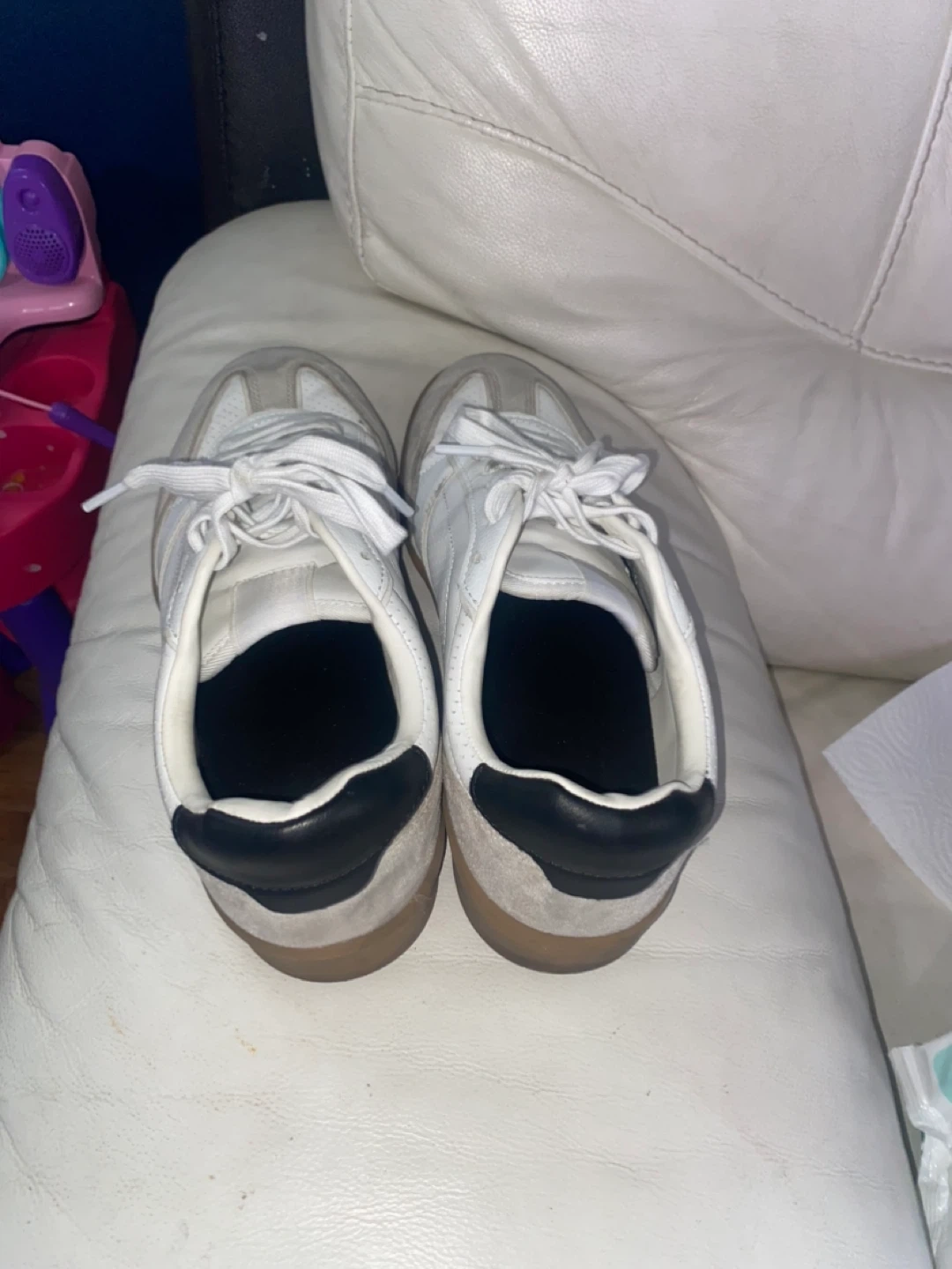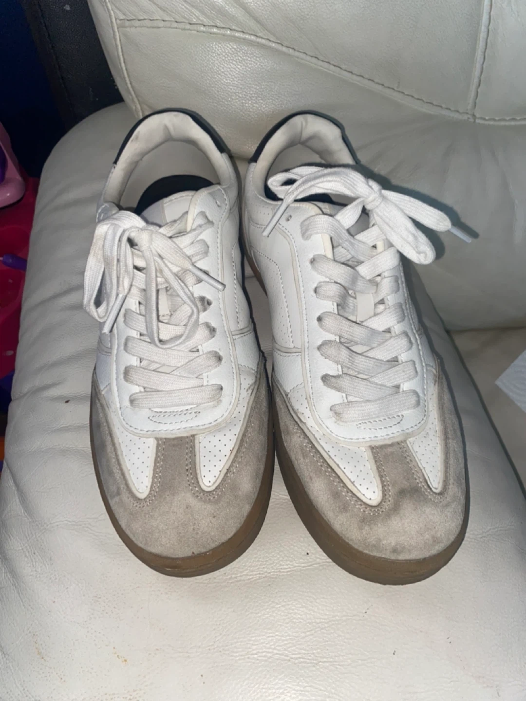 Selling a pair of white leather sneakers. They show some signs of wear, as you can see in the photos. Please take a close look at the pictures to get a better idea of the condition!