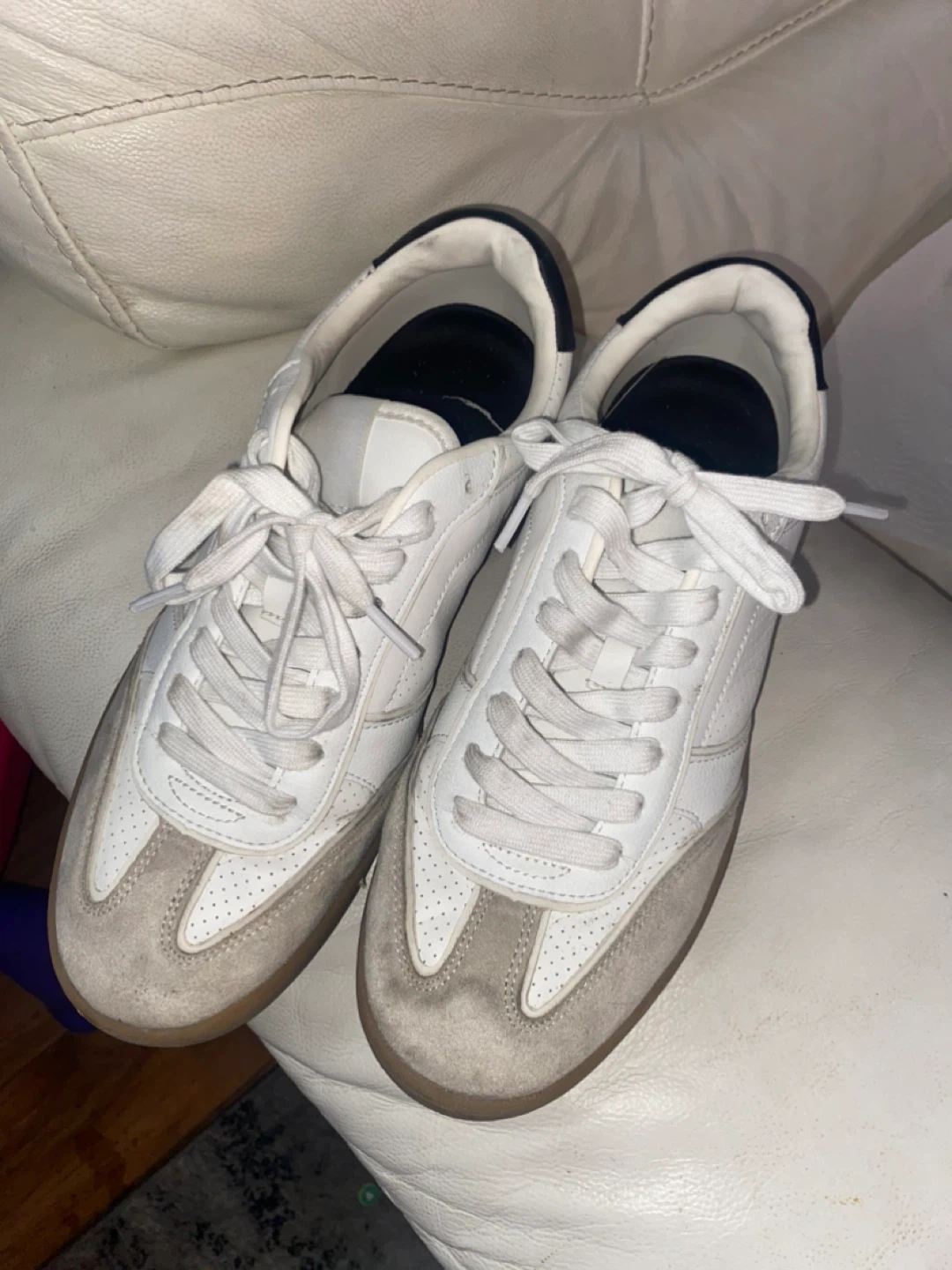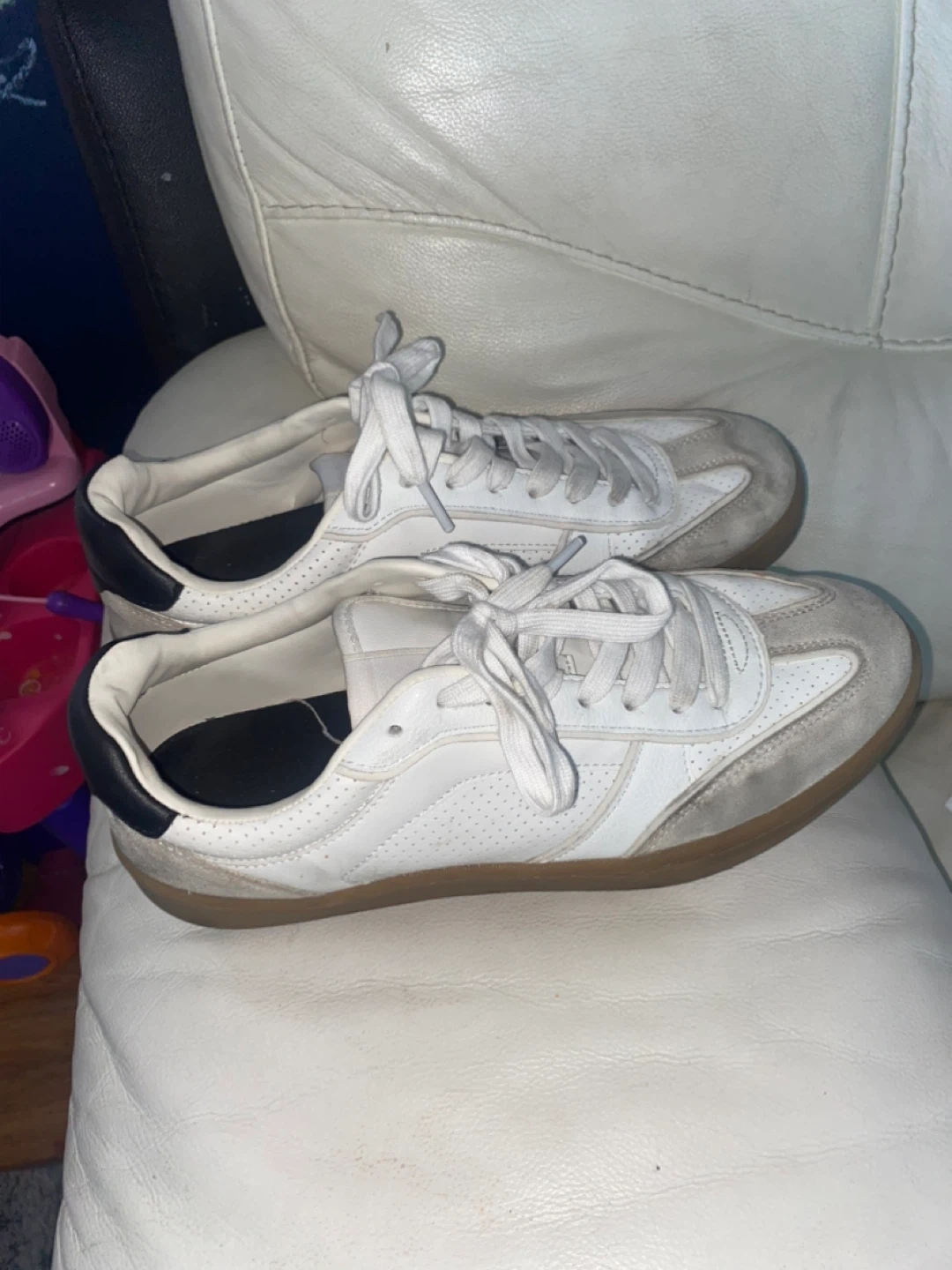 Selling a pair of white leather sneakers. They show some signs of wear, as you can see in the photos. Please take a close look at the pictures to get a better idea of the condition!