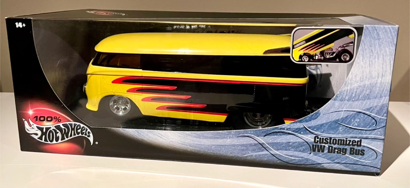 This is a Hot Wheels Customized VW Drag Bus. It features a bright yellow and black paint scheme with flame decals. It's a 1:18 scale collectible. Recommended for ages 14 and up.