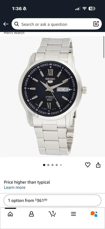 For sale a Seiko SNKP17 automatic watch in new condition. I only tried it on once and am selling it because it is large for my wrist. It was a gift from my wife and was originally purchased from Amazon. Makes a great gift.