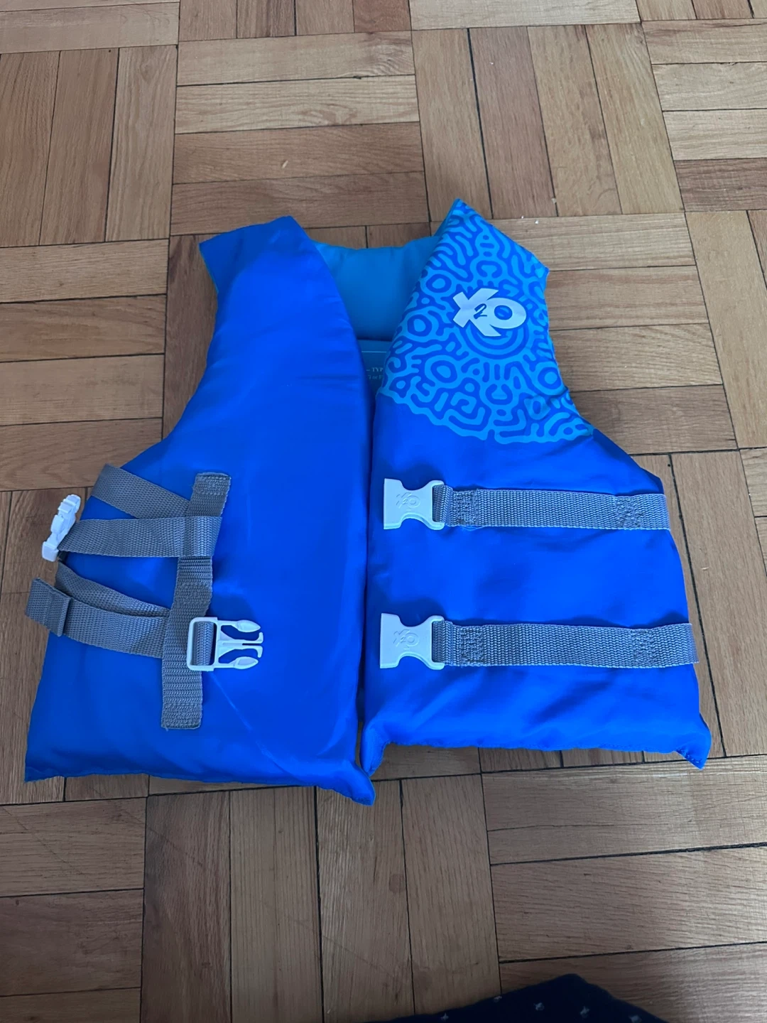 This blue Onyx life vest is designed for youth. It has adjustable straps and a buckle closure for a secure fit. This vest is great for water activities!