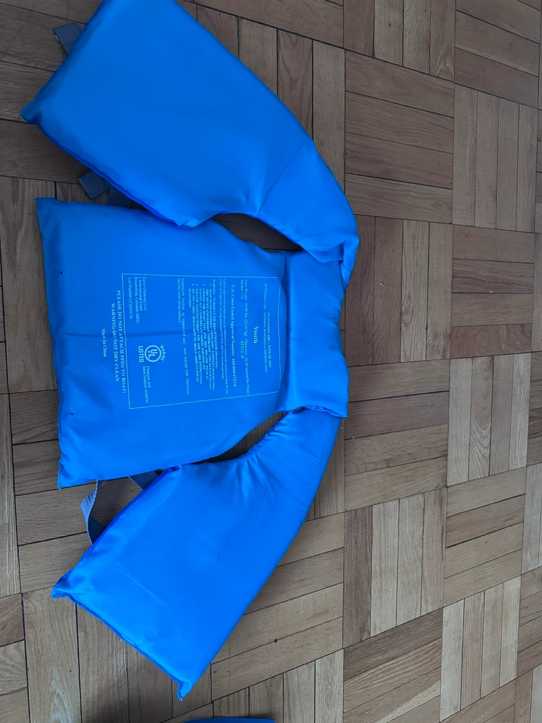 This blue Onyx life vest is designed for youth. It has adjustable straps and a buckle closure for a secure fit. This vest is great for water activities!