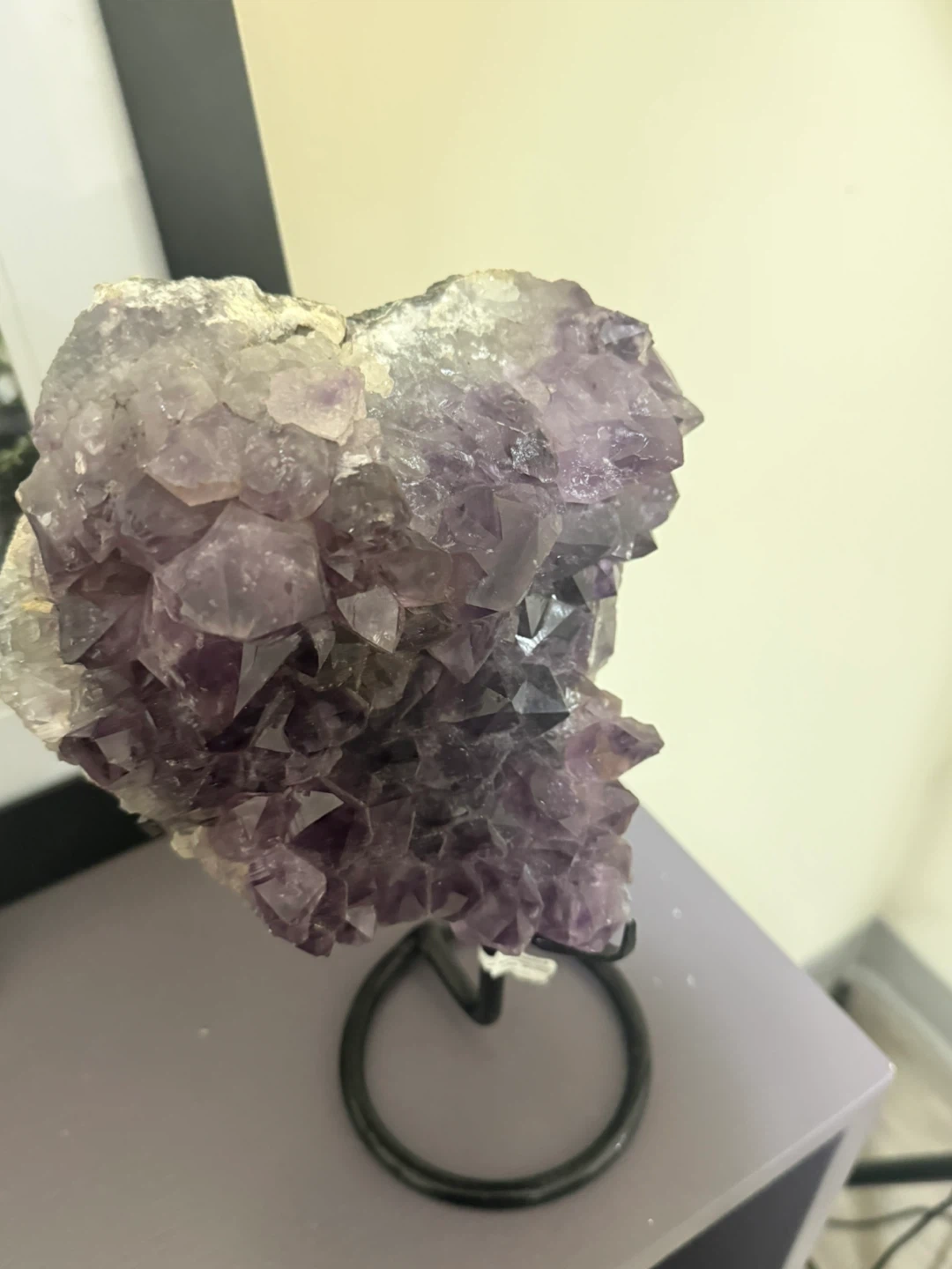 A natural amethyst crystal cluster on a metal stand. Its purple hues range from pale lilac to deep violet. This piece adds a touch of natural beauty to any space.