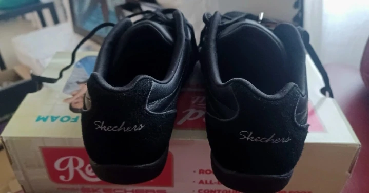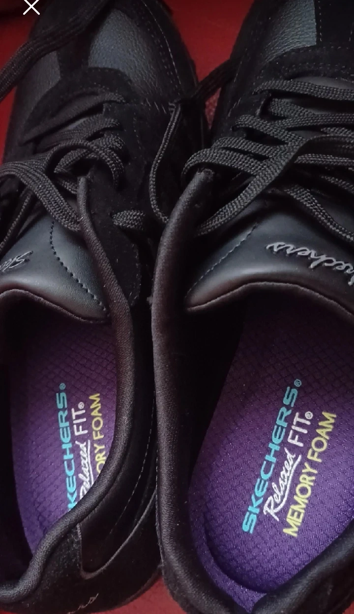 Black Skechers Relaxed Fit women's sneakers. These shoes feature memory foam insoles for all-day comfort. Relaxed fit provides a roomier feel. Size 8.