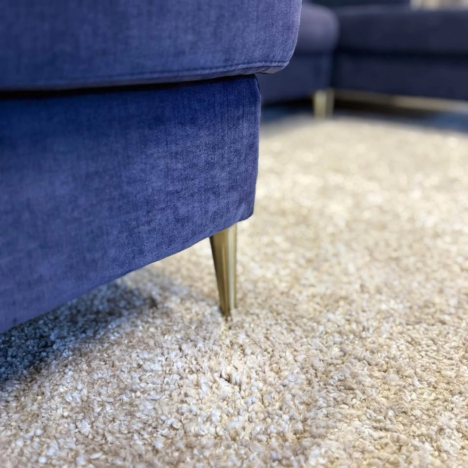 Upholstered in a deep midnight blue fabric with a soft, smooth feel.