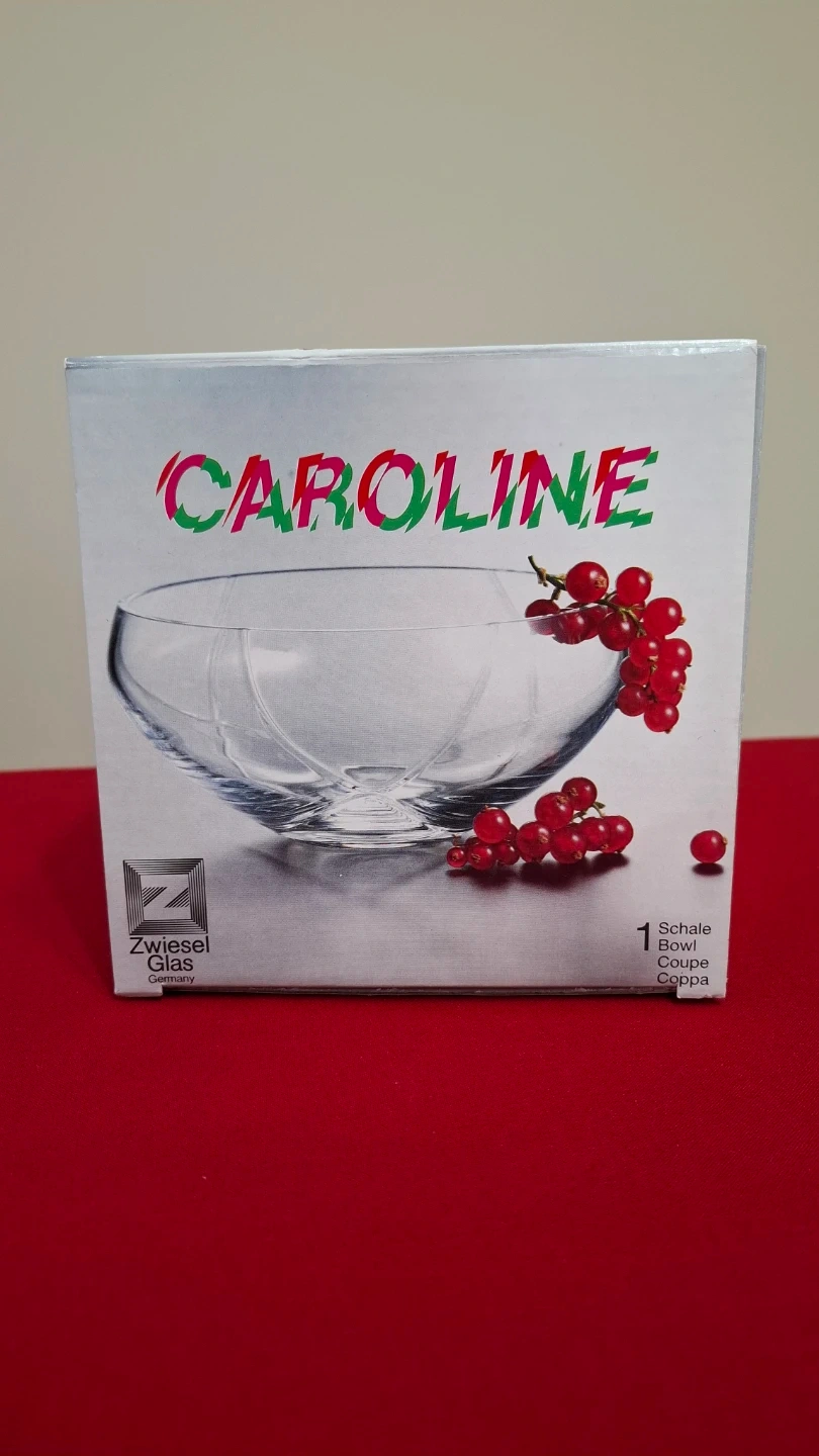This is a clear glass serving bowl from Zwiesel Glas. It's part of the Caroline collection. The bowl has a textured swirl pattern on the exterior. Comes in original box.