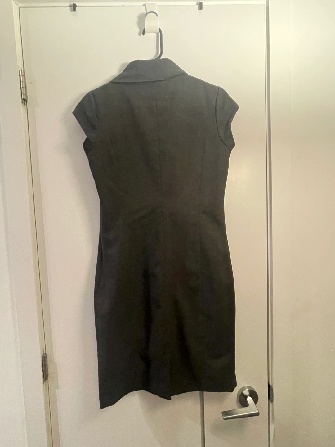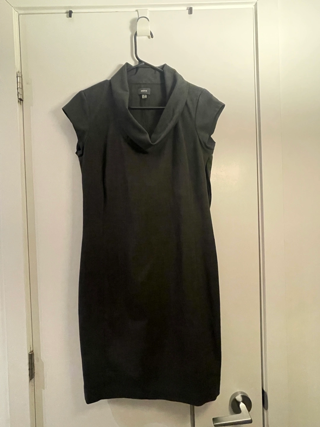 Simple dark grey sheath dress. Short sleeves, collared neckline. Excellent for work or special events.