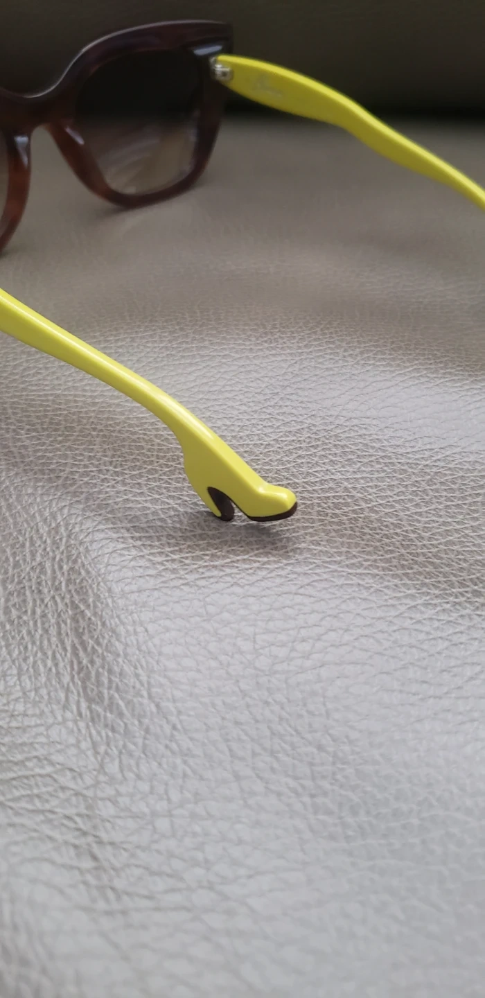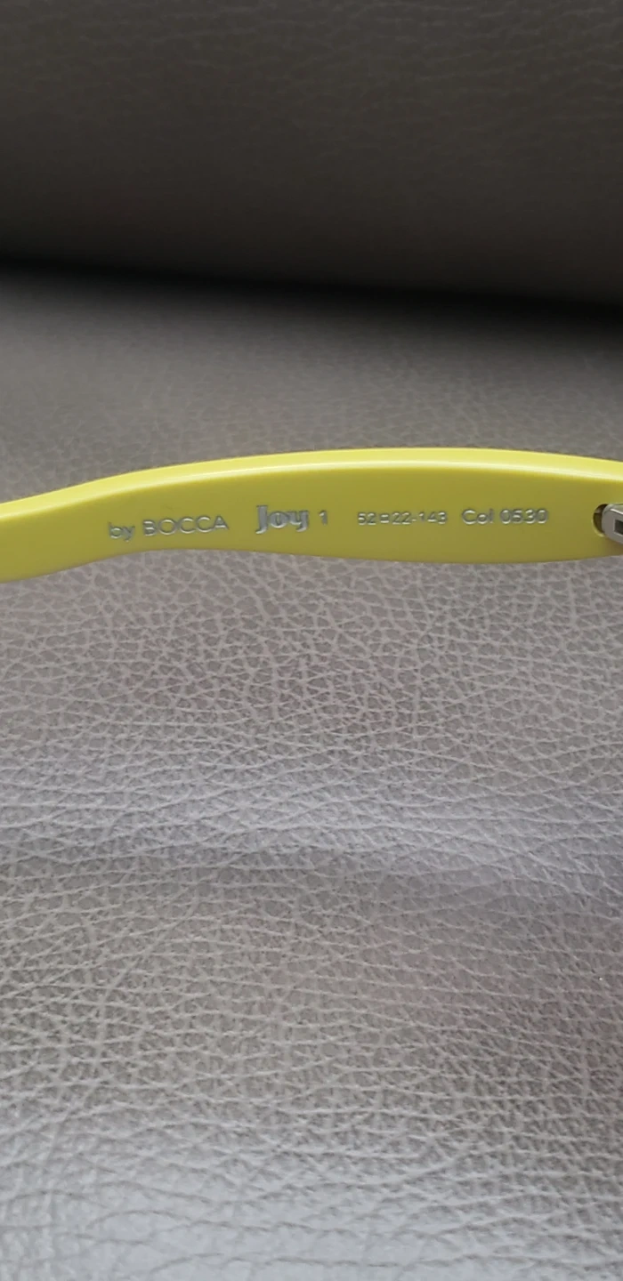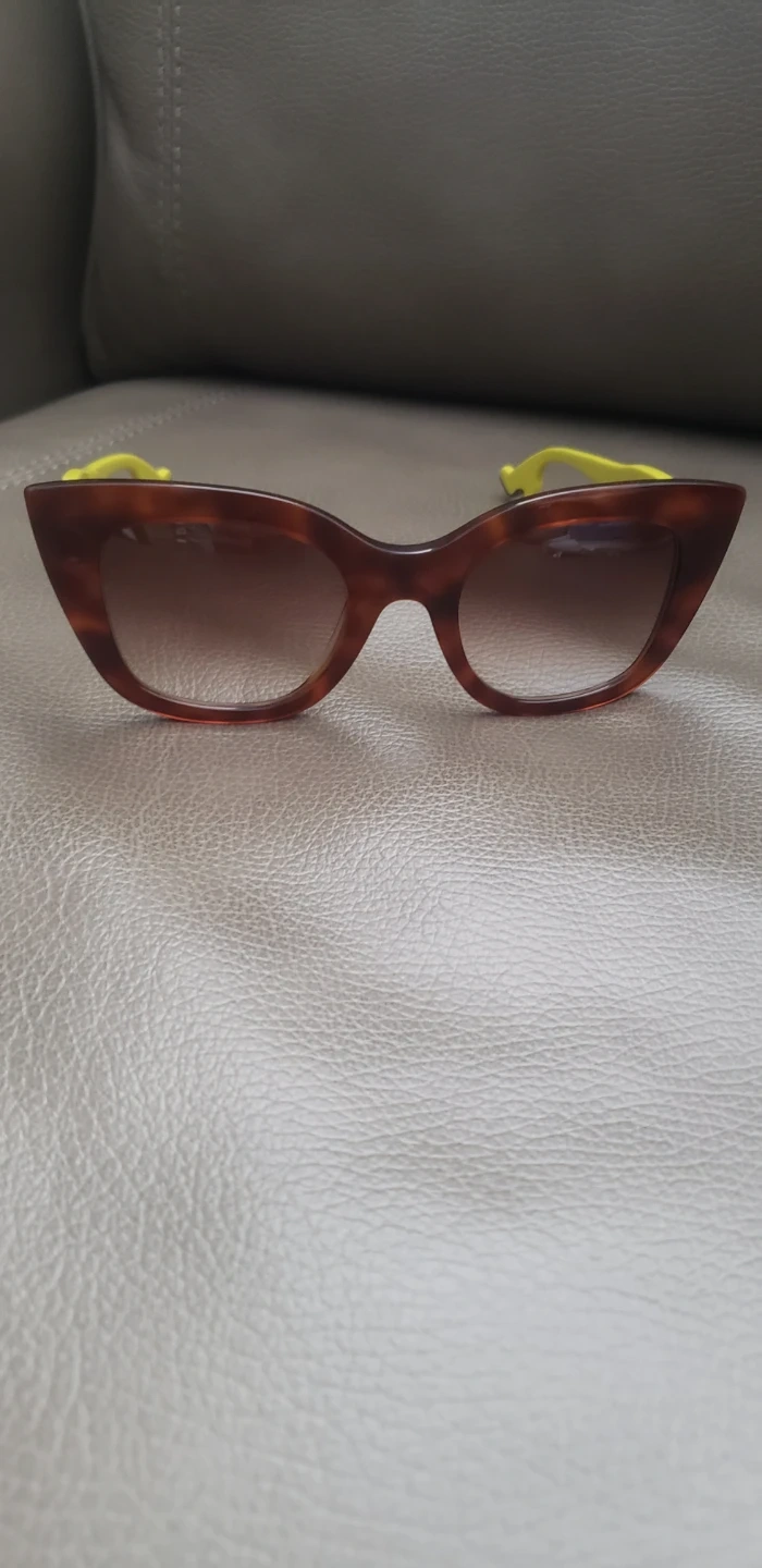 These Pre-owned Face A Face BOCCA Joy 1 Cat Eye sunglasses 52-22-143 Col 0530 Hand Made in Italy feature a trendy tortoiseshell frame with bright yellow arms. The lenses offer a gradient tint for stylish sun protection. A unique accent at the end of each arm adds a playful touch!
