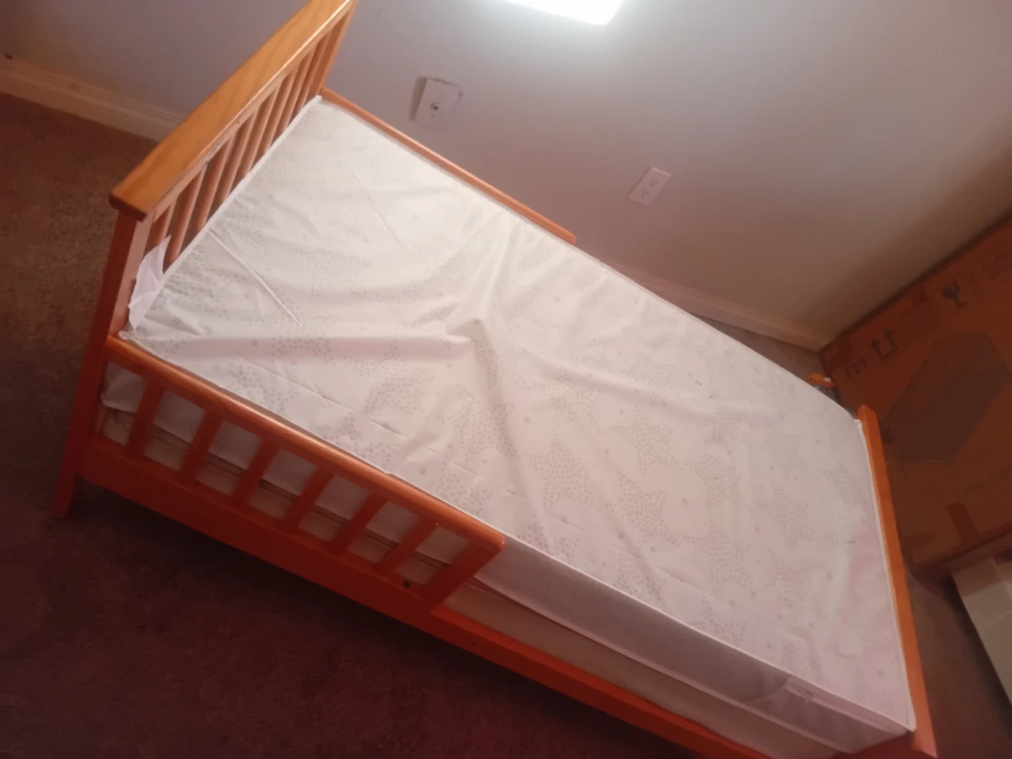 This is a wooden toddler bed. It comes with a white mattress featuring a star pattern. The bed frame is made of wood and has slatted sides. It's suitable for young children transitioning to a bed.